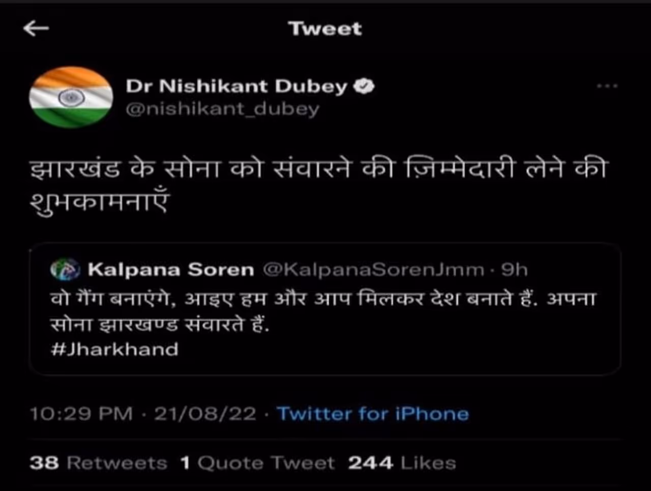 हालाकि मामलें में पुलिस शिकायत होने के बाद से ही सोशल मीडिया में अकाउंट डिलीट कर दिया गया है। साथ ही भाजपा सांसद निशिकांत दुबे की पोस्ट में किया गया कमेंट भी हट गया है। अब इस मामलें में सांसद ने प्रदेश हेमंत सोरेन से कहां है कि फर्जी अकाउंट बनाने वाले को पकड़े।