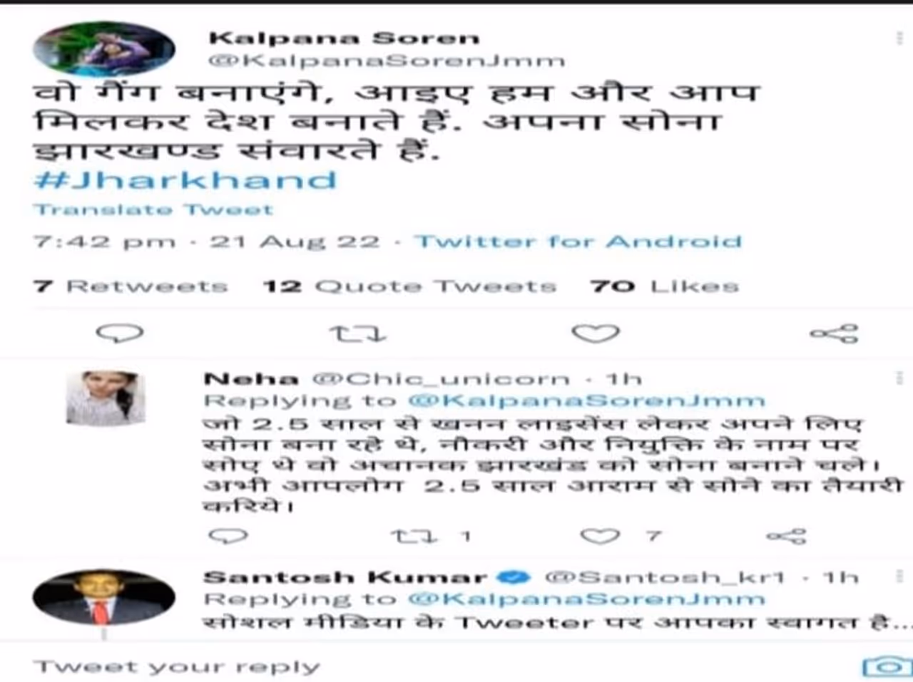 सीएम की पत्नी कल्पना सोरेन के फर्जी ट्ववीटर अकाउंट से कुछ पोस्ट भी किया गया है। एक पोस्ट में लिखा गया है कि वे गैंग बनाएंगे, आइए हम और आप मिलकर देश बनाते हैं। अपना सोना झारखंड संवारते हैं। इस पोस्ट पर कई कमेंट्स भी आए हैं। लोगों को लगा का सीएम की पत्नी ने ही यह पोस्ट किया है। बाद में लोग समझ गए की अकाउंट फर्जी है। पोस्ट पर कई ने पक्ष में तो कई में खिलाफ में कमेंट किया है। साथ ही आजादी को लेकर भी कई पोस्ट फर्जी अकाउंट से किए गए। सांसद निशिकांत दूबे के पोस्ट पर फर्जी अकाउंट्स से वे गैंग बनाएंगे, आइए हम और आप मिलकर देश बनाते हैं। अपना सोना झारखंड संवारते हैं कमेंट किया गया है।