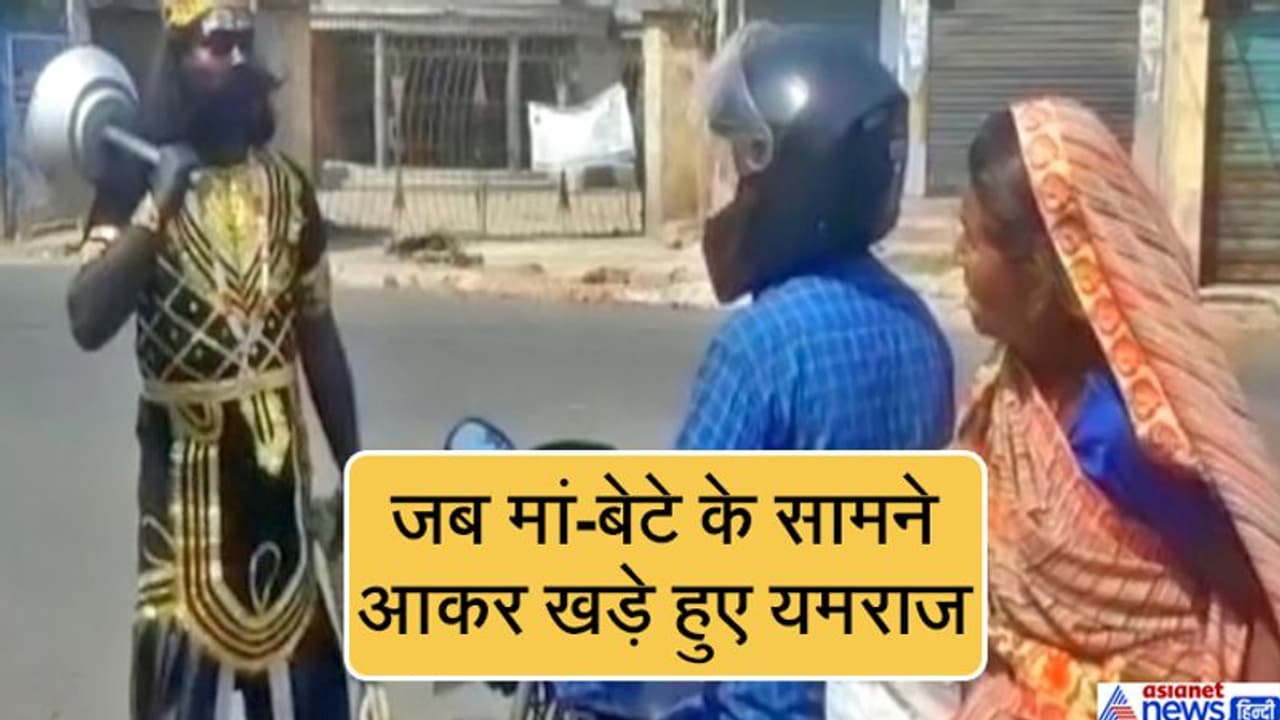 यहां थाने के ड्राइवरों को कोरोना यमराज बनाया गया है। एक बेटा बाइक पर बैठाकर अपनी मां को ले जा रहा था। अचानक यमराज सामने आ गया। यह देखकर मां-बेटे घबरा गए। जब उन्हें बताया गया कि कोरोना संक्रमण से बचना है, तो मास्क पहनें..घर से न निकलें, तो उन्हें अपनी गलती समझ में आई।
