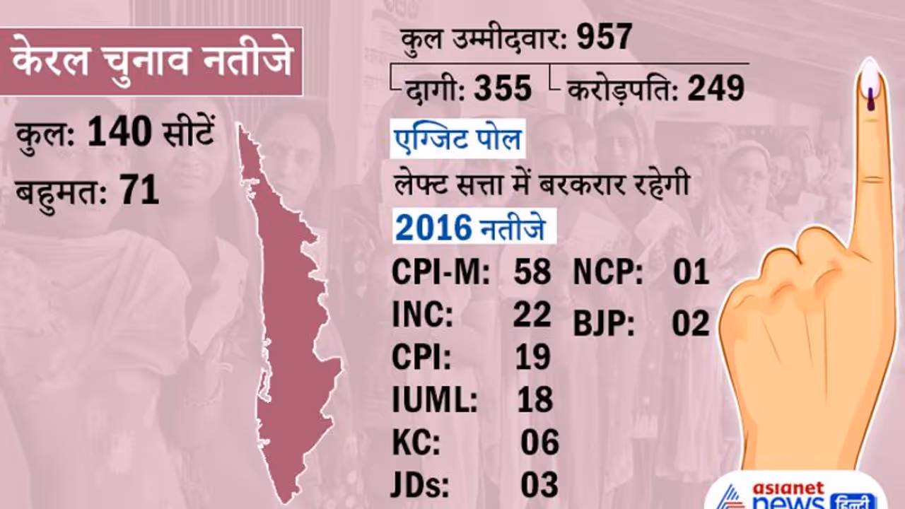 केरल में इस बार चुनाव 957 उम्मीदवार मैदान में हैं। एडीआर ने 928 उम्मीदवारों का विश्लेषण किया है। इनमें से 364 राष्ट्रीय दलों से, 52 राज्य दलों से, 201 गैर मान्यता प्राप्त दलों से जबकि 311 निर्दलीय प्रत्याशी मैदान में हैं। 928 उम्मीदवारों में से 355 ने अपने ऊपर आपराधिक मामले घोषित किए हैं। वहीं, 167 के ऊपर गंभीर आपराधिक मामले दर्ज हैं। वहीं, 928 में से 249 उम्मीदवार करोड़पति हैं।