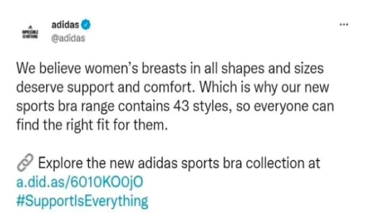 बहरहाल, सोशल मीडिया के अलग-अलग प्लेटफॉर्म पर इसका विरोध तेजी से हो रहा है। वहीं, ट्विटर ने तो इस पर एडिडास का साथ दिया और इसे न्यूडिटी नहीं मानते हुए विज्ञापन को शर्तो का उल्लंघन नहीं बताया। बता दें कि कंपनी ने प्रचार के लिए विज्ञापन में 24 महिलाओं के नंगे स्तन दिखाए हैं, जिसके बाद मामले में विरोध प्रदर्शन शुरू हो गया। कंपनी ने अपने विज्ञापन में बताया कि हमारा मानना है कि महिलाओं के सभी साइज और आकार के स्तन को सपोर्ट तथा आराम की जरूरत होती है। हम नए स्पोर्ट्स ब्रा रेंज लाए हैं, जिससे हर महिला अपने हिसाब से फिट ब्रा चुन सके।