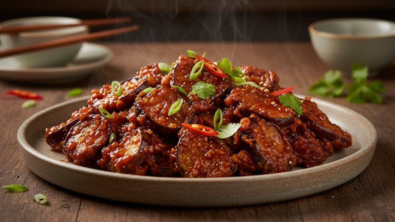 लास्ट में क्रिस्पी फ्राइड बैंगन डालकर सॉस में टॉस करें। 30–40 सेकंड में मंचूरियन तैयार!
