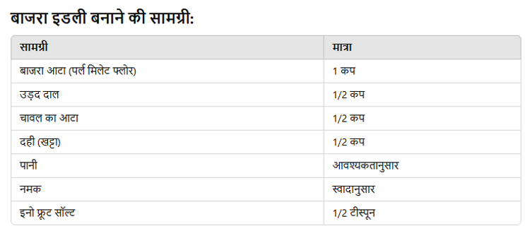 फूड डेस्क : क्या आप भी इस संडे को हेल्दी बनाने का प्लान बना रही हैं? अगर हां तो हमारे पास एक खास रेसिपी है। इस वीकेंड के लिए आप बाजरा इडली बनाने का एक बेहतरीन ऑप्शन चुन सकती हैं। यह न सिर्फ स्वादिष्ट होती है, बल्कि पोषण से भरपूर भी रहेगी। क्योंकि बाजरा फाइबर, आयरन और प्रोटीन का अच्छा सोर्स है। इससे इम्यूनिटी मजबूत होती है और पाचन भी दुरुस्त रखता है।