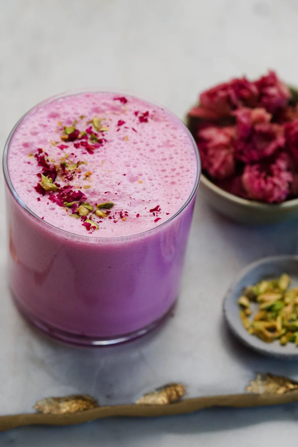 गुलाब की लस्सी बनाना काफी आसान है। सबसे पहले गुलाब की पंखुड़ियों को पानी में डालकर 7-8 घंटे तक भिगा लें। फिर इसमें चीनी डालकर उबाल लें। फिर जब यह गाढ़ा हो गए। तब आप इसमें दही और पानी में आधा कप गुलाब का शरबत मिलाएं और फिर मिक्स करके सर्व कर दें।
