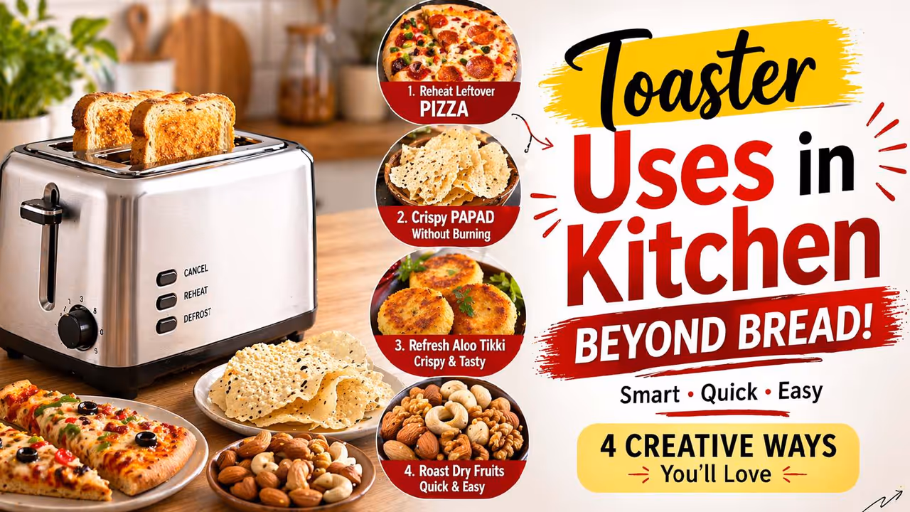 Kitchen Appliance Tips: टोस्टर सिर्फ ब्रेड सेंकने के लिए ही नहीं, बल्कि कई किचन कामों में बेहद काम का साबित हो सकता है। पिज़्ज़ा गर्म करने से लेकर पापड़ भूनने और सूखे मेवे रोस्ट करने तक, इसके स्मार्ट इस्तेमाल आपके किचन टाइम को आसान और फास्ट बना देते हैं।