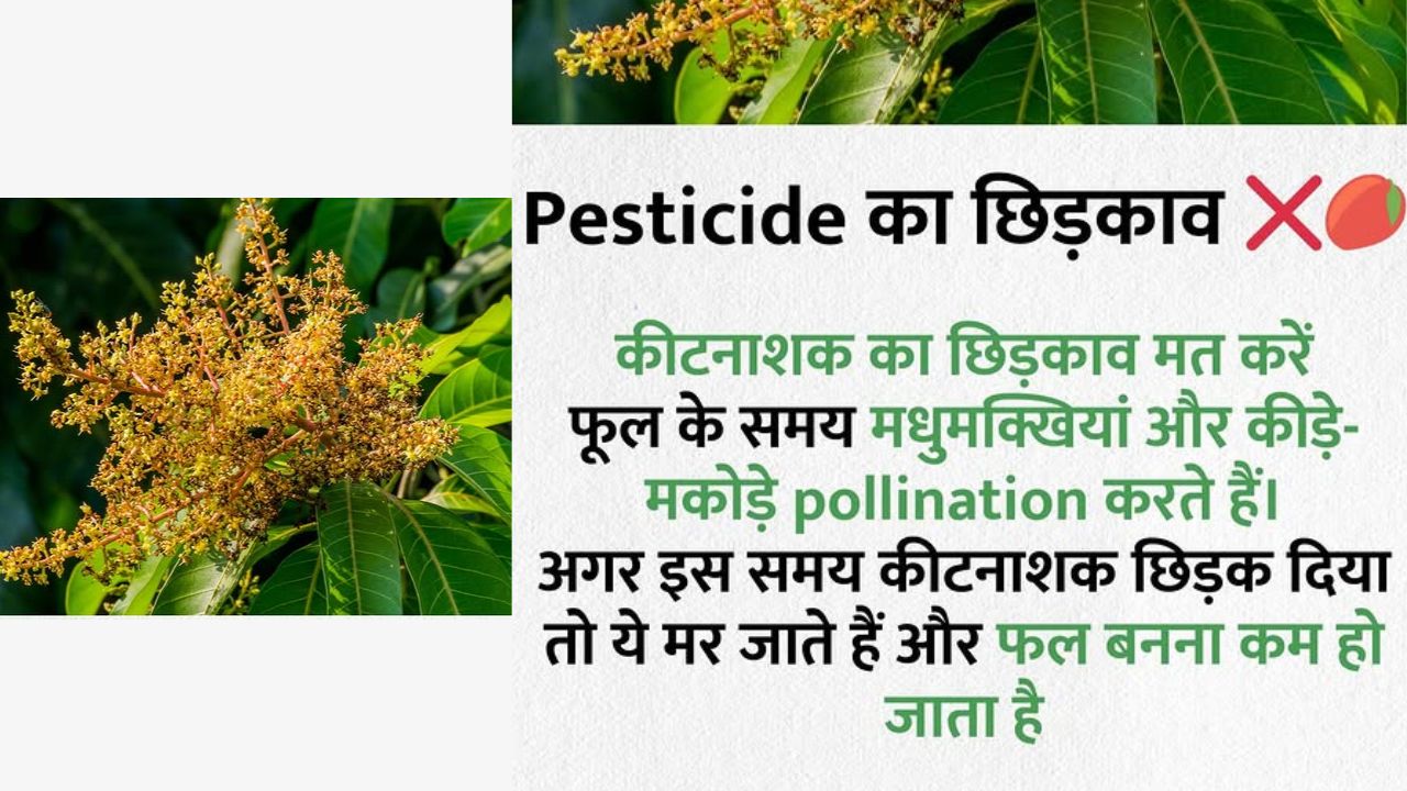 जब आम के पेड़ पर फूल आते हैं, तब मधुमक्खियां, तितलियां और दूसरे छोटे कीट फूलों पर बैठकर परागण (Pollination) की प्रक्रिया पूरी करते हैं। यही प्रक्रिया बाद में फल बनने में मदद करती है। अगर इस समय तेज या जहरीले कीटनाशक स्प्रे कर दिए जाएं तो ये परागण करने वाले कीट मर सकते हैं या पेड़ से दूर चले जाते हैं। इसका सीधा असर फल बनने की प्रक्रिया पर पड़ता है और पेड़ पर फल कम लगते हैं। इसलिए मंजरी आने के समय कैमिकल स्प्रे से बचें और जरूरत हो तो हल्के जैविक उपाय ही अपनाएं।
