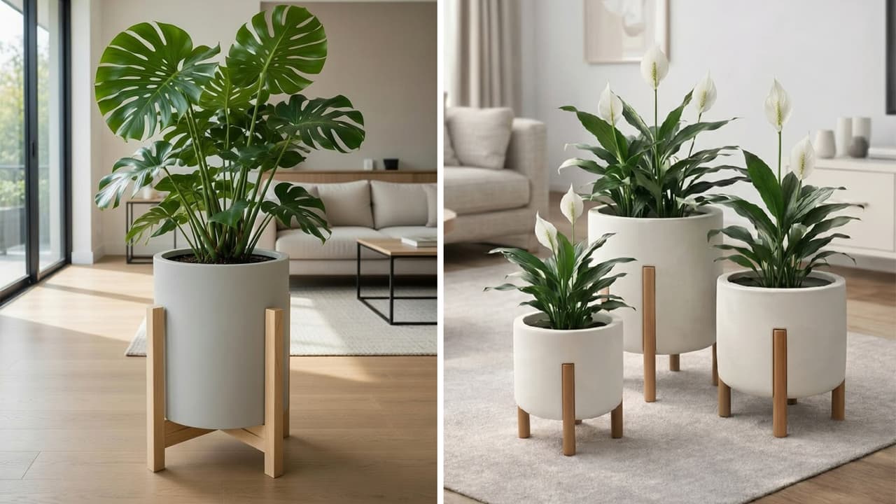 अगर आप अपने घर में क्लीन लुक चाहते हैं और चाहते हैं कि पौधा जमीन से ऊपर रहे, ताकि नीचे पानी फैले नहीं और गंदगी ना हो, तो इस तरह के बाउल डिजाइन के बड़े से कंक्रीट प्लांटर ले सकते हैं, जिसमें ट्रिपल स्टैंड दिया हुआ है। ये वुडन स्टैंड जमीन से ऊपर प्लांट को रखते हैं और बहुत ही स्टाइलिश लुक देते हैं।