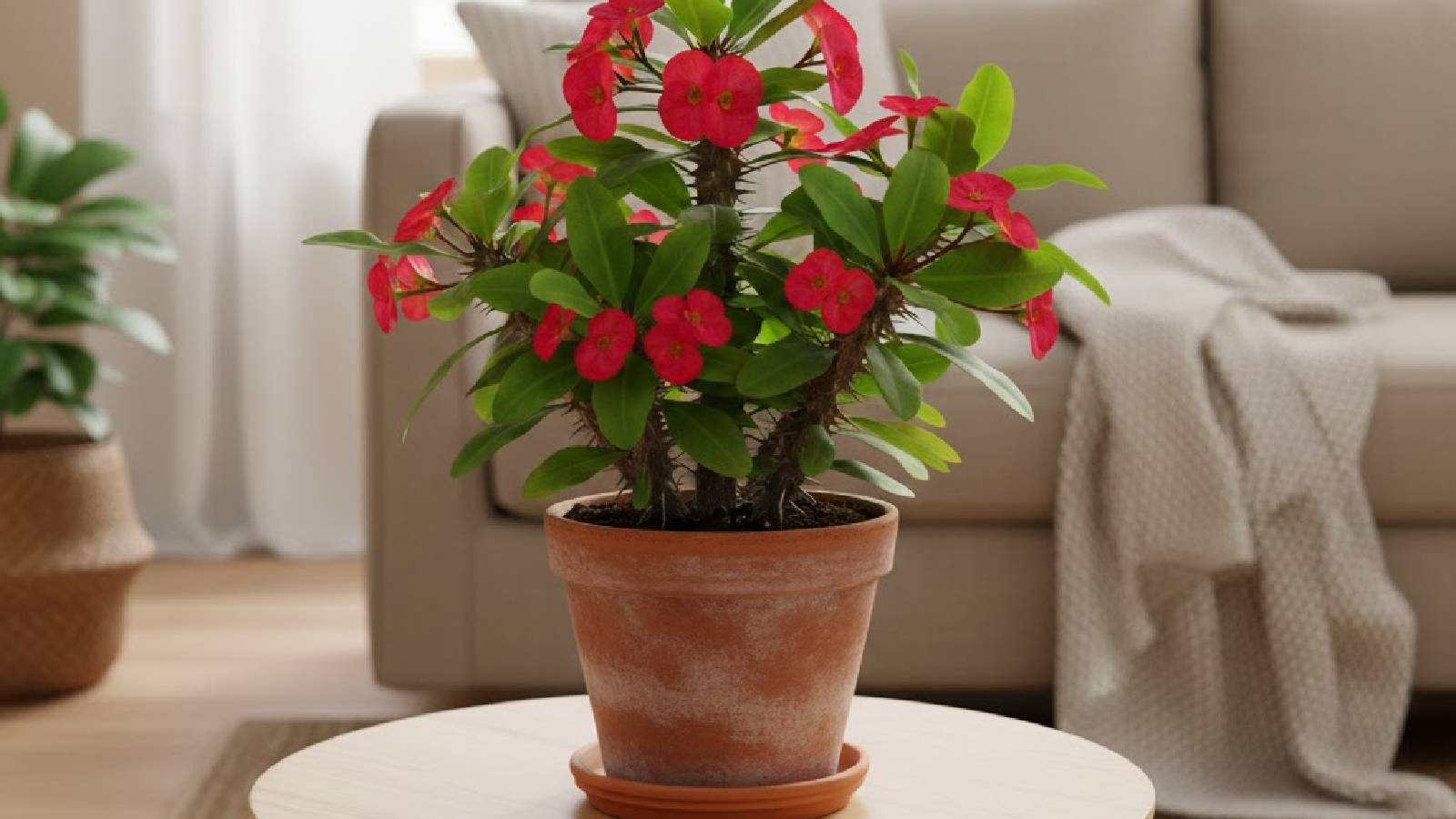 क्राउन ऑफ थॉर्न्स एक अनोखा कांटेदार पौधा है जिसमें छोटे, रंग-बिरंगे फूल खिलते हैं। इसके कांटे इसे एक अलग पहचान देते हैं, और फूल घर की सुंदरता बढ़ाते हैं। यह पौधा कम देखभाल में भी लंबे समय तक हरा-भरा रहता है। इसे बालकनी या खिड़की के पास रखने से घर खास और आकर्षक लगता है।