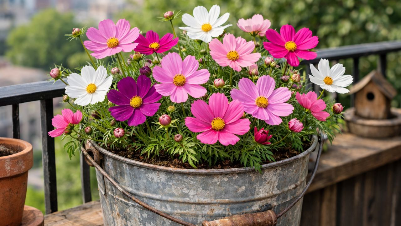 कॉसमॉस बेहद हल्की मिट्टी में तेजी से बढ़ने वाला फूल है। इसके गुलाबी, सफेद और बैंगनी रंग के फूल बालकनी को बेहद आकर्षक बना देते हैं। यह पौधा कम पानी में भी आसानी से बढ़ जाता है, इसलिए बाल्टी गार्डनिंग के लिए बिल्कुल परफेक्ट है।