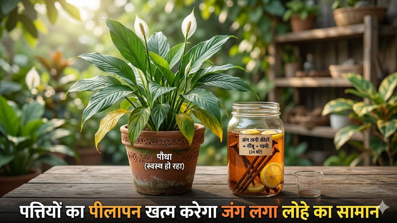 अगर पौधे की पत्तियां पीली पड़ रही हैं, तो आप एक आसान उपाय के तहत पौधों को हरा-भरा बना सकते हैं। इसके लिए आपको कुछ खरीदने की जरूरत नहीं बल्कि घर में पड़ी बेकार जंग लगी लोहे का सामान काम आएगा। जी हां! पौधों में आयरन की कमी के कारण पत्तियां पीली पड़ने लगती हैं। अगर थोड़ा सा आयरन देंगे, तो पौधा फिर से हरा-भरा हो जाएगा। आइए जानते हैं कैसे जंग लगी कील पीले पत्ते वाले पौधे को फिर हरा-भरा बना देती है।