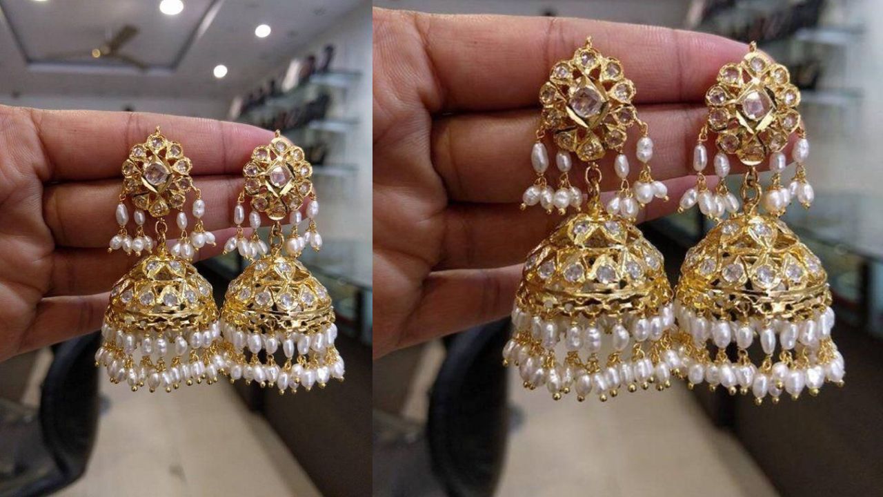 - पर्ल वर्क जड़ाऊ झुमका की ये डिजाइन मॉडर्न और ट्रेडिशनल टच दे रही है।