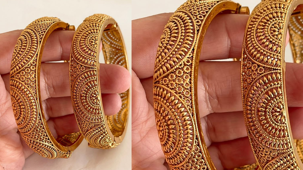 एंटीक लुक वाली गोल्ड बैंगल्स आजकल बहुत डिमांड में हैं। यह पुराने जमाने की रॉयल फील देती हैं और 10 ग्राम में बनवाना आसान है। इनको पहनने पर ऐसा लगता है कि जैसे विरासत में मिले हों। साथ ही ये लॉन्ग टर्म इन्वेस्टमेंट के लिए बेस्ट।
