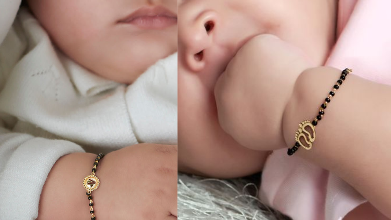22Kt Gold Bracelet खरीदना जेब एलाऊ नहीं कर रहा है तो आप 9kt पर भी बेटे के लिए ब्रेसलेट बनवा सकते हैं। ये सस्ता होने के साथ बिल्कुल असल सोने का लगता है। यहां पर मोतियों के साथ नजरिया ब्रेसलेट बनाया गया है। आप चाहे तो इसे गोल्ड पर भी बनवा सकते हैं। इसमें बेटे के नाम का अक्षर और पैर के निशान के साथ कस्टमाइज कराएं। ये 3000-4000 रु तक बनकर तैयार हो जाएगा।