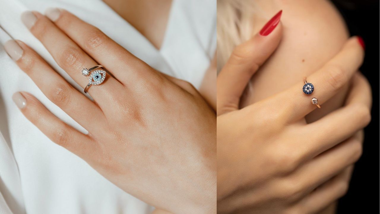 ब्लू एविल आई या नजर बट्टू वाले डिज़ाइन आजकल बहुत ट्रेंड में हैं। ये स्टाइलिश दिखते हैं और साथ ही पहनने वाले को बुरी नजर से बचाने की मान्यता भी है। गोल्ड या सिल्वर बेस पर बना ब्लू ऐविल आई पेंडेंट रिंग किसी भी इंडियन या वेस्टर्न ड्रेस के साथ जचता है।