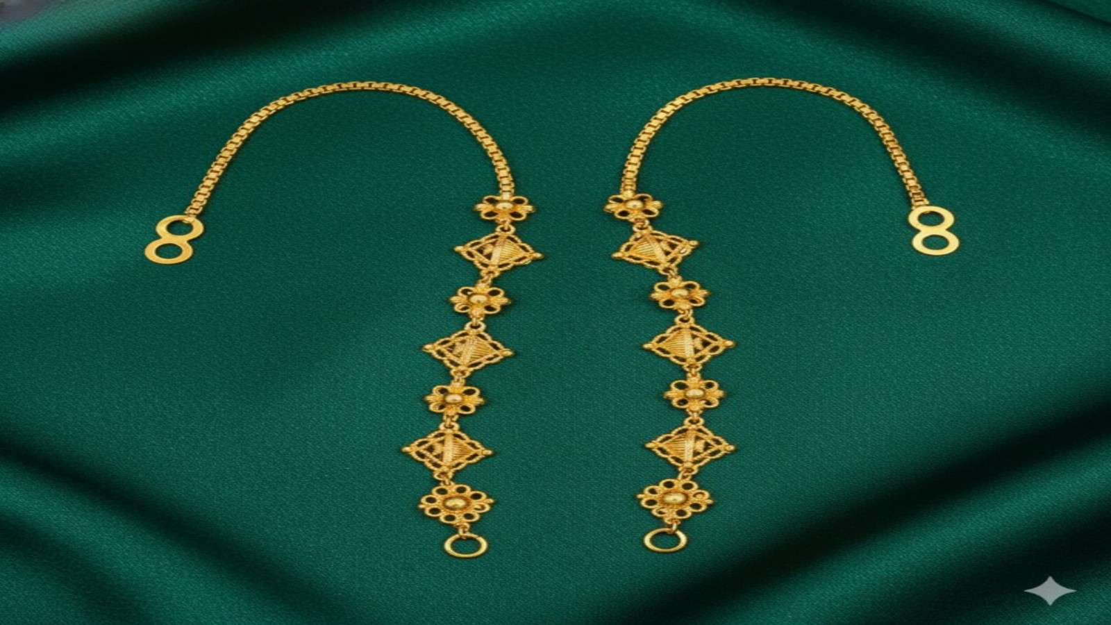 नक्काशी और एंब्रोसिंग वर्क पर आने वाले ये गोल्ड प्लेटेड इयररिंग्स वजन में हल्के लेकिन दिखने में बिल्कुल 1 तोला वाला अंदाज दे रहे हैं। इसे भी जालीदार पैटर्न, संकली चेन पर बनाया गया है, जहां चेन दो पार्ट में डिवाइड है। साथ में स्नैक पैटर्न वाली दूसरी चेन लुक इंहेंस करेगी। गोल्ड प्लेटेड पर ऐसे इयररिंग्स 100-200रु के बीच खरीदे जा सकते हैं।