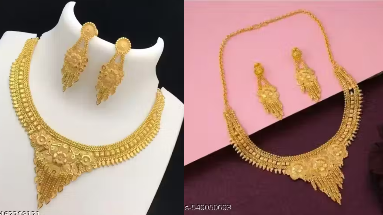 शादी के बाद ससुराल में पहला फंक्शन है, तो नई बहुरिया वाले ठाठ दिखाते हुए गोल्ड प्लेटेड नेकलेस पहनें। इसे जाली-बूटी वर्क पर तैयार किया गया है। ये दिखने में बिल्कुल असली सोने की तरह लग रहा है। आप इसे हर तरह के आउटफिट संग कैरी कर सकती हैं। इसे मीशो से ₹153 में खरीदा जा सकता है।