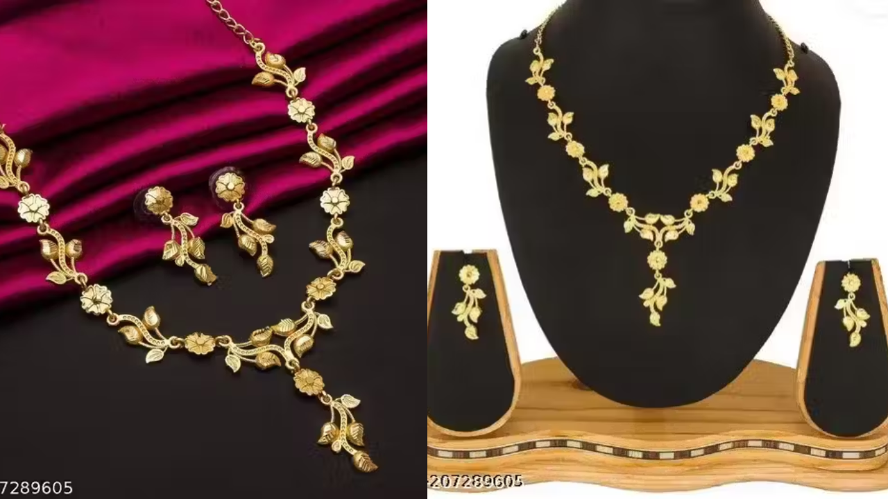 फ्लोरल पैटर्न पर ऐसा पतला सा नेकलेस आजकल बहुत डिमांड में है। इसमें छोटी-छोटी पत्तियों के साथ वेवी लुक दिया गया है। आप बिना किसी परेशानी दिनभर कैरी कर सकती हैं। मीशो पर ये हार ₹104 में उपलब्ध है।