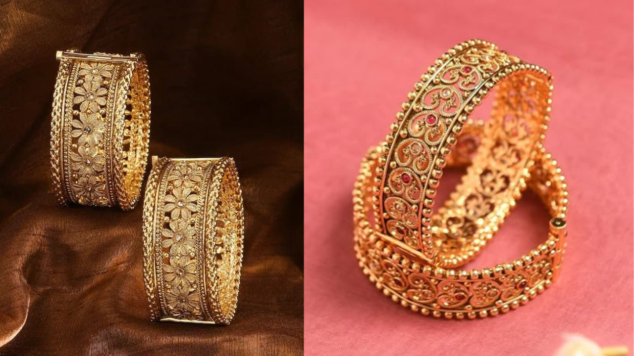 पुरानाी परंपरा में मॉडर्न ट्विस्ट जोड़ते हुए पेंच वाले कड़े चुनें, कलाई को सुंदर फिटिंग देने के साथ बहुत एलीट लगते हैं। कड़ा फूलों की नक्काशी पर है, सिल्क साड़ी या इंडो-वेस्टर्न के साथ पेयर करें। यह एक हैवी स्टेटमेंट पीस है जो जिसे पहन आप रानी से कम तो नहीं लगने वाली। 22kt Gold Bangle Price में इसे खरीदना थोड़ा महंगा है, ऐसे में एंटीक गोल्ड फिनिश और पॉलिश पर चुनें। जो जल्दी खराब नहीं होगा और हर ड्रेस के साथ बोल्ड क्लास देगा।