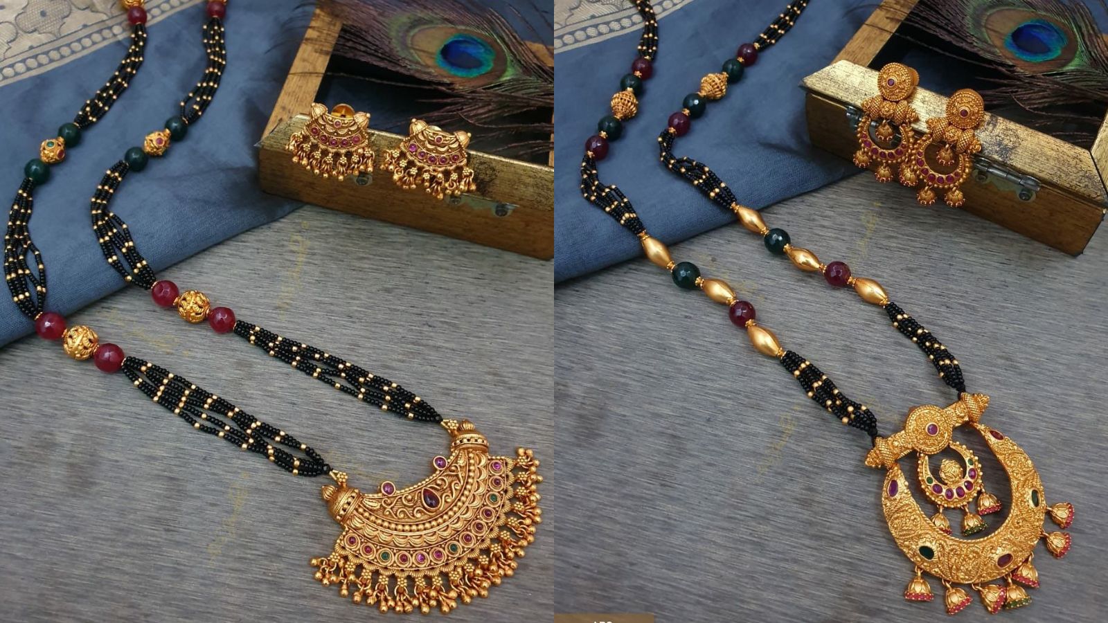 काले और सुनहरे मोती के साथ ये अर्ध चांद वाली पेंडेंट की ये डिजाइन मराठी महिलाएं खूब पसंद करती हैं। इस तरह के खूबसूरत मंगलसूत्र लॉन्ग पैटर्न में ज्यादा जचेगा।