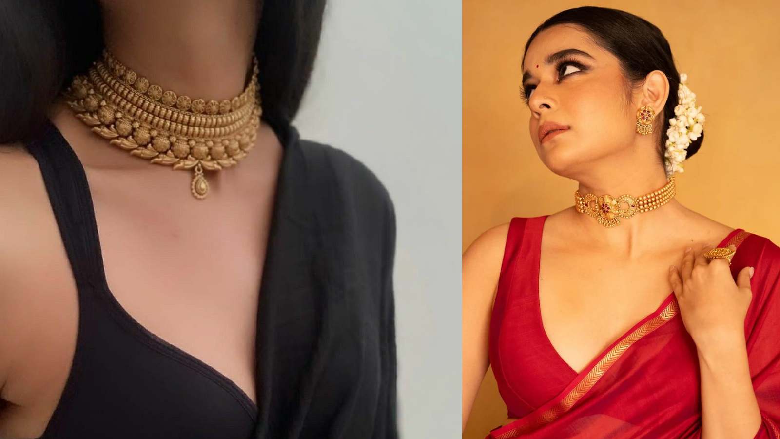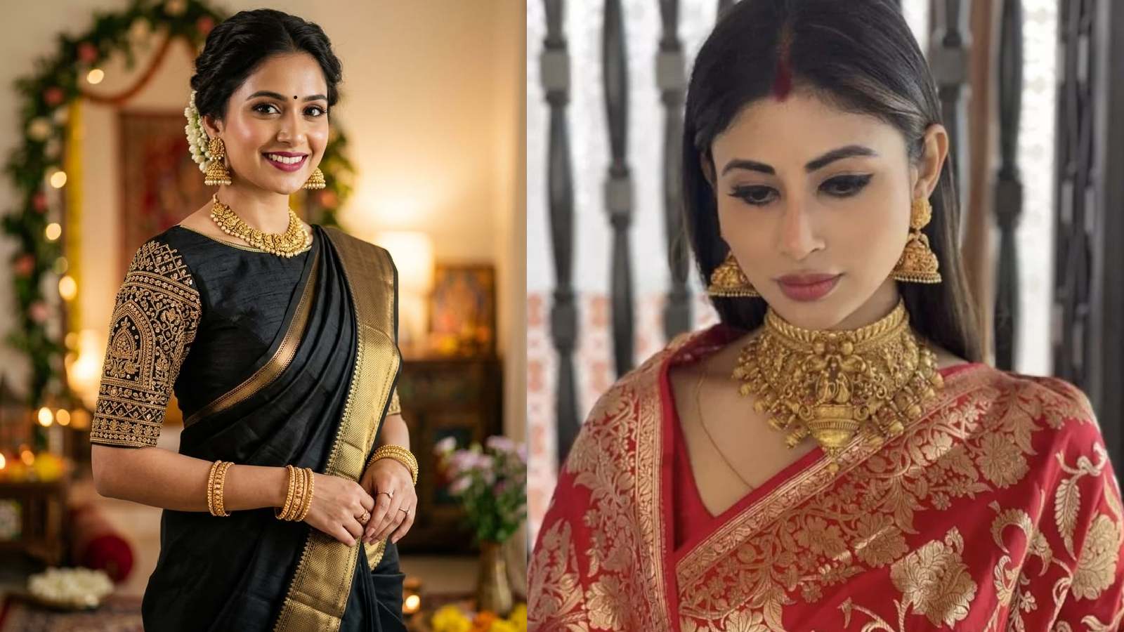 ब्लैक और रेड साड़ी के साथ गोल्ड चोकर सेट बेहद रॉयल और ट्रेडिशनल लुक देता है। खासतौर पर डीप नेक ब्लाउज के साथ यह और भी उभरकर आता है। अगर आप हेवी जूलरी पसंद करती हैं, तो चोकर के साथ छोटे ईयररिंग्स पेयर करें। यह स्टाइल शादी या रिसेप्शन जैसे फंक्शन के लिए बिल्कुल परफेक्ट है।