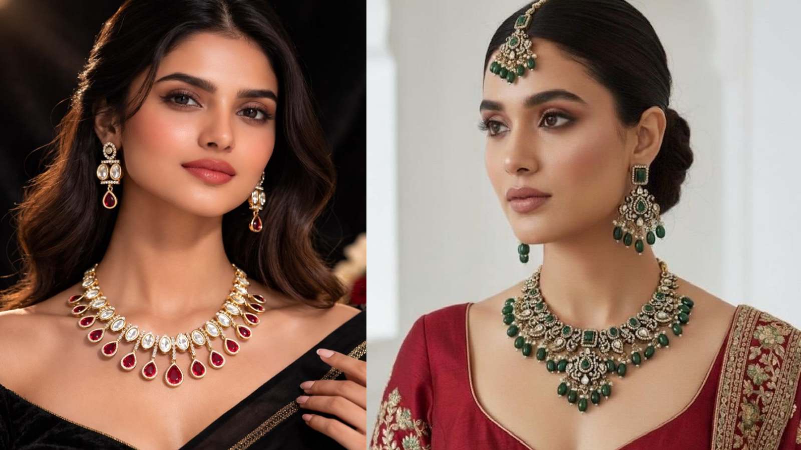 कुंदन जूलरी का एलीगेंस ब्लैक-रेड साड़ी के साथ कमाल का लगता है। इसका हल्का शाइन और रिच फिनिश आपके पूरे लुक को क्लासी बना देता है। आप कुंदन नेकलेस के साथ मैचिंग झुमके पहन सकती हैं। यह स्टाइल खासतौर पर फेस्टिव या ट्रेडिशनल इवेंट्स में बेहद खूबसूरत नजर आता है।