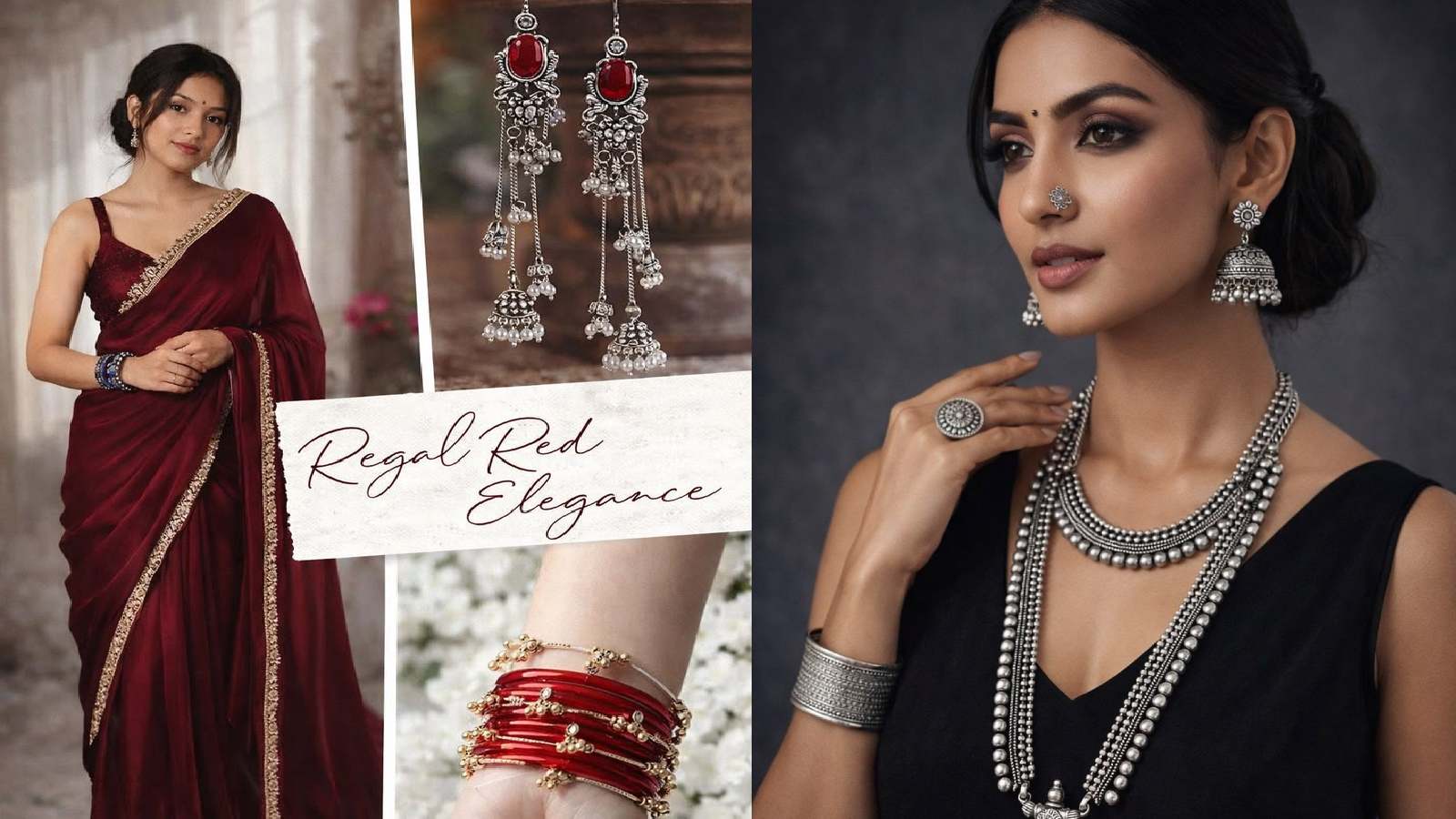 अगर आप कुछ हटके और ट्रेंडी चाहती हैं, तो ऑक्सीडाइज्ड सिल्वर जूलरी ट्राई करें। यह ब्लैक साड़ी के साथ खासतौर पर बहुत स्टाइलिश लगती है और रेड कलर को भी बैलेंस करती है। बड़े झुमके या स्टेटमेंट नेकलेस के साथ यह लुक इंडो-वेस्टर्न वाइब देता है, जो आजकल काफी ट्रेंड में है।