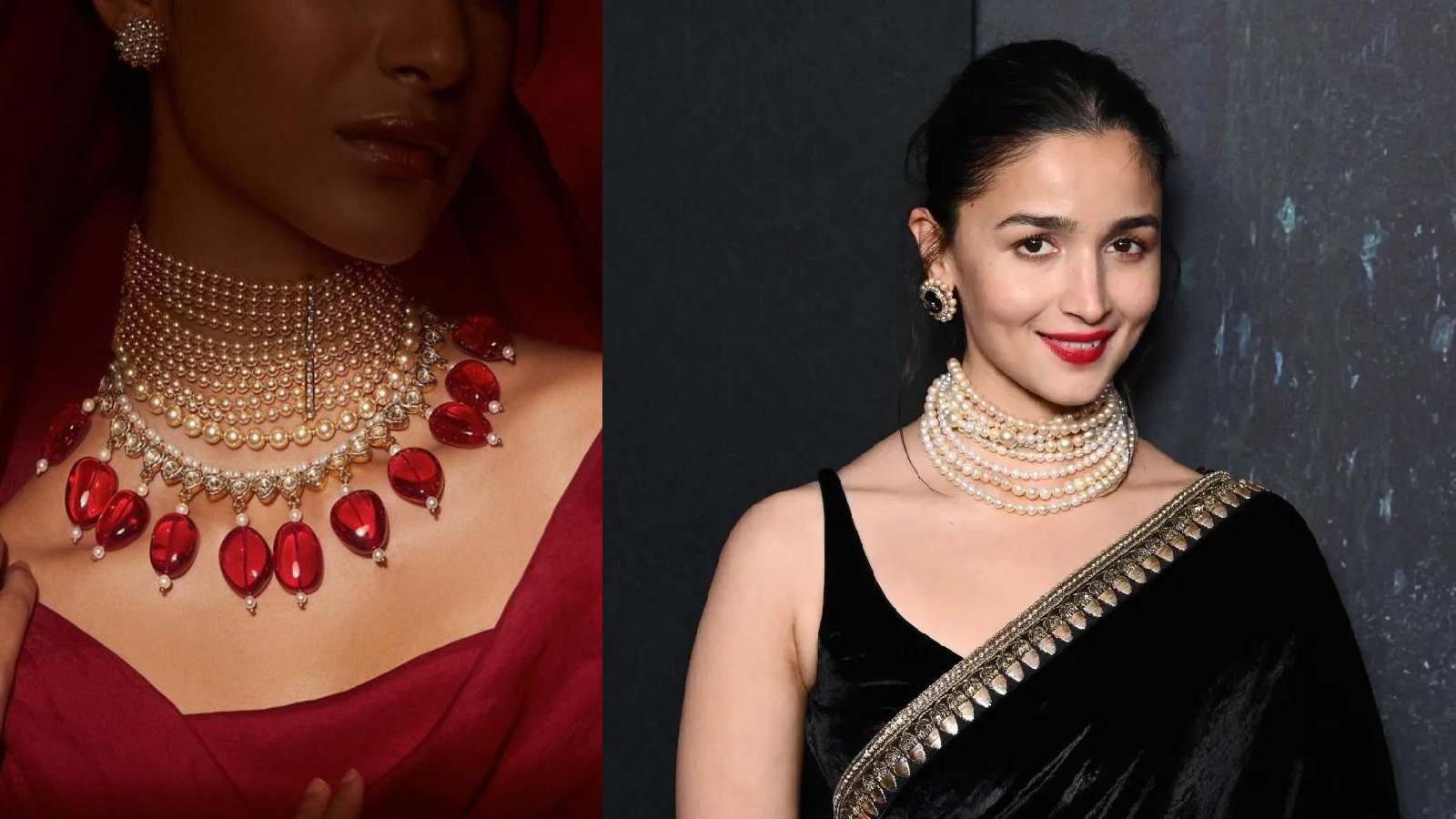 पर्ल जूलरी का सॉफ्ट और क्लासी लुक ब्लैक और रेड साड़ी के साथ बेहद खूबसूरत लगता है। खासतौर पर अगर आप मिनिमल स्टाइल पसंद करती हैं, तो पर्ल नेकलेस या स्टड्स एक परफेक्ट ऑप्शन हैं। यह लुक ऑफिस पार्टी या डे इवेंट्स के लिए काफी सटल और एलीगेंट लगता है।
