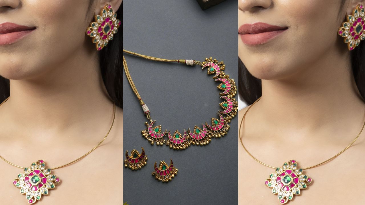 कुंदन वर्क का जादू कभी पुराना नहीं होता। यह नेकलेस सेट देखने में बिल्कुल शादी वाले गोल्ड सेट जैसा लगता है। रेड या ग्रीन स्टोन वर्क के साथ ये हर ट्रेडिशनल आउटफिट के साथ सूट करेगा। इसे डीप नेक ब्लाउज या बनारसी साड़ी के साथ पहनें। ऑनलाइन यहां से खरीदें।