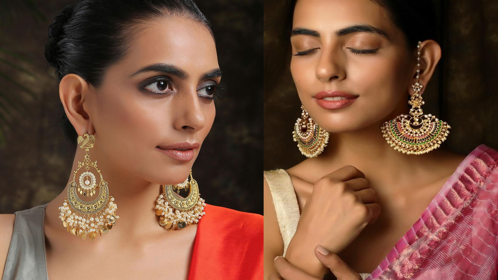 इस तस्वीर में दिखाई गई दोनों चांदबाली इयररिंग्स अपने आप में बेहद खास और आकर्षक हैं। बाईं ओर की चांदबाली ट्रेडिशनल गोल्डन टच में बनी है, जिस पर बारीक नक्काशी और नीचे मोती की लटकनें इसे रॉयल और एथनिक अंदाज देती हैं। वहीं, दाईं ओर की चांदबाली आधुनिक और एलीगेंट लुक के लिए परफेक्ट है, जिसमें सुनहरी डिजाइन के साथ सफेद मोतियों की कई परतें जुड़ी हुई हैं। दोनों ही चांदबाली को फेस्टिव और शादी के लहंगे के साथ पहना जा सकता है।