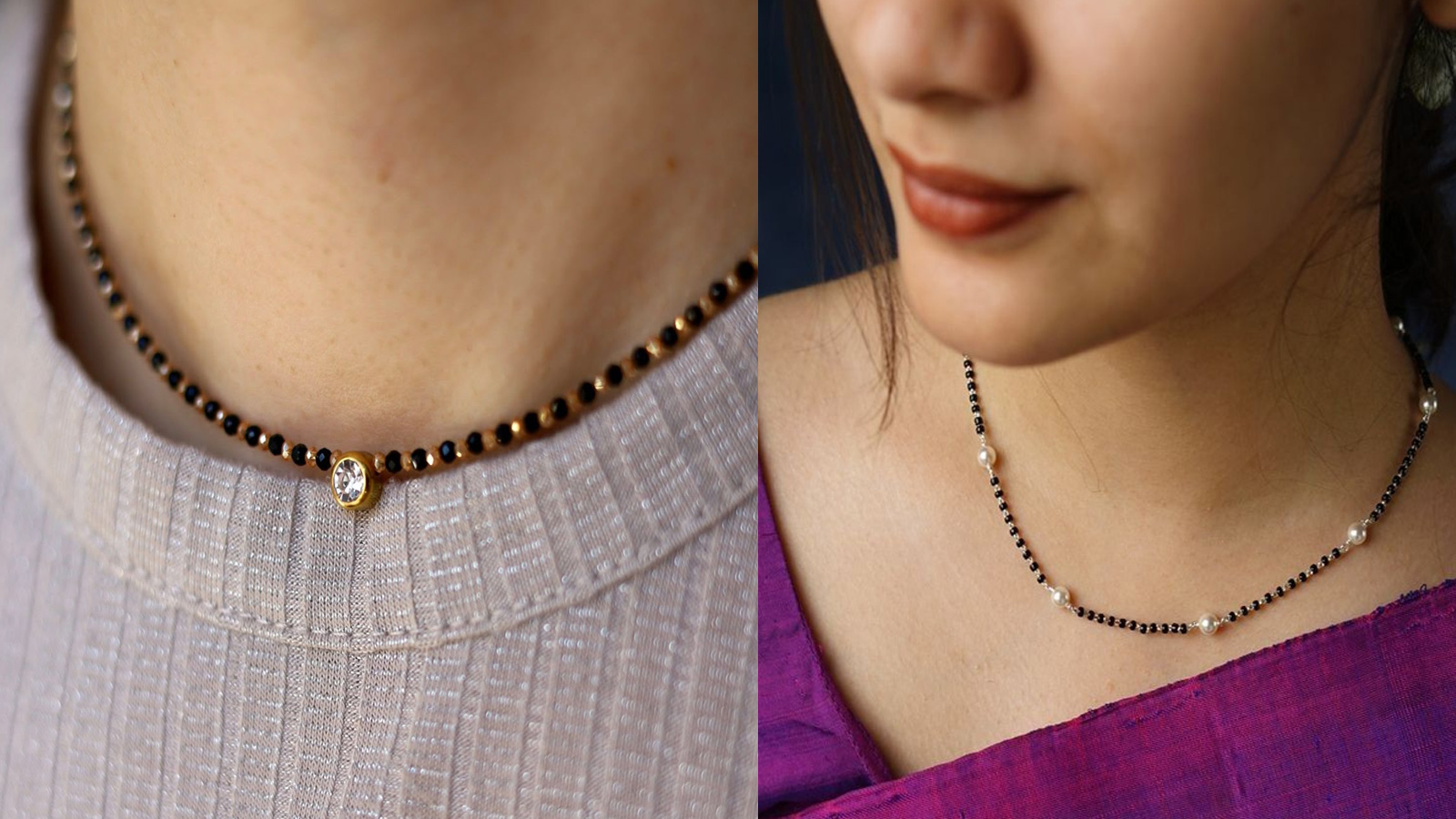 अगर आपको पूरे गले में सटाकर मंगलसूत्र नहीं पहनना पसंद है तो इन डिजाइंस पर नजर डाल सकती हैं। गोल्ड और ब्लैक बीड्स के साथ बने मंगलसूत्र में छोटा सा डायमंड जोड़ा गया । वहीं दूसरे में ब्लैक बीड्स के साथ व्हाइट मोती जोड़ा गया है। वेस्टर्न आउटफिट के साथ साड़ी और सूट पर भी ये डिजाइंस परफेक्ट लगेंगी। रेगुलर यूज में भी आप इसे आसानी से पहन सकती हैं।