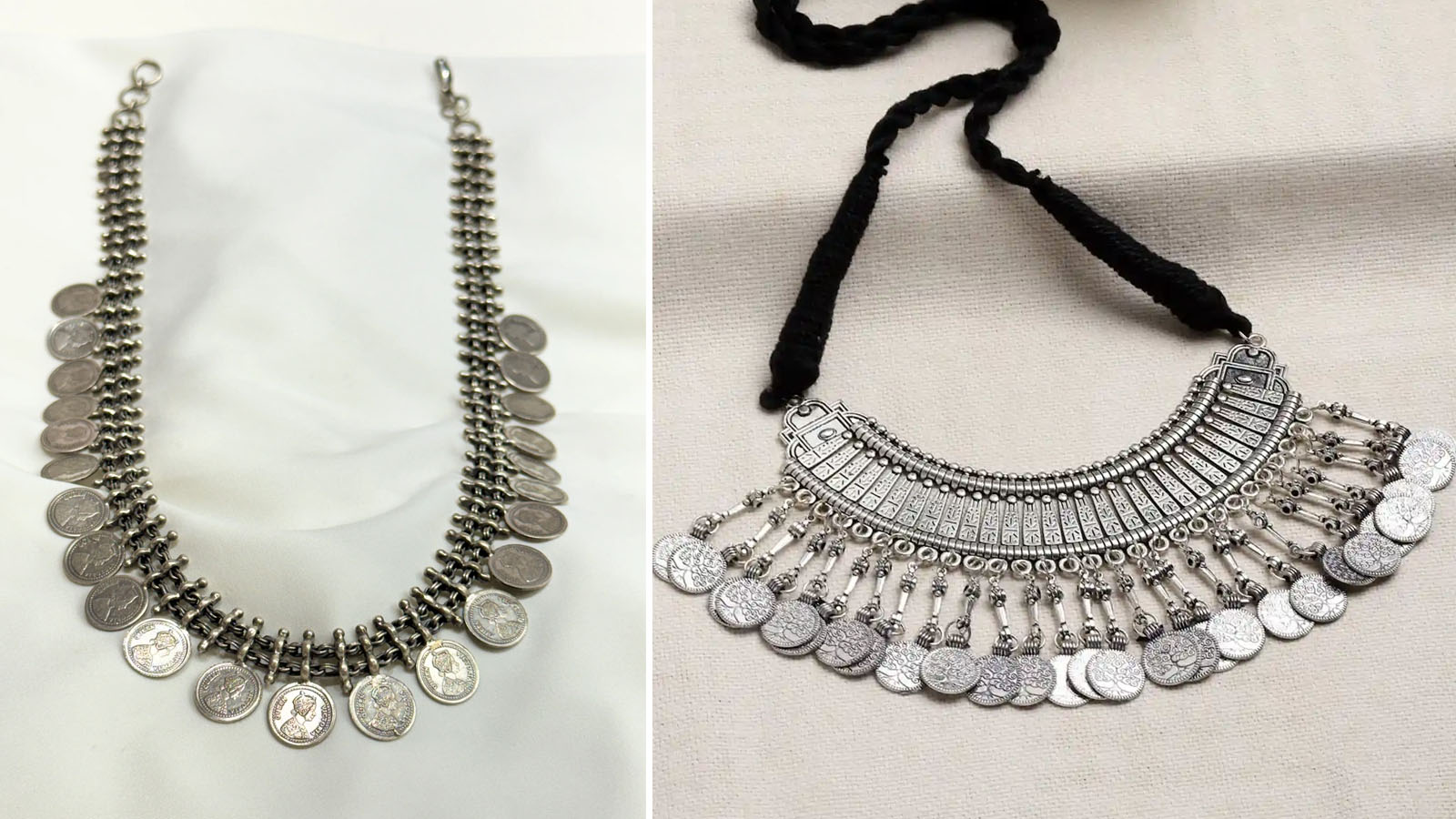 अगर आप हैवी नेकलेस पसंद नहीं करतीं, तो यह डिजाइन आपके लिए है। सिंगल या 2-3 छोटे कॉइन्स वाले नेकलेस डेली वियर और ऑफिस लुक के लिए बेस्ट हैं। इस तरह के नेकलेस सिंपल लेकिन एलिगेंट लगते हैं। कम बजट में यह सबसे ज्यादा वर्सेटाइल सिल्वर ज्वेलरी मानी जाती है।