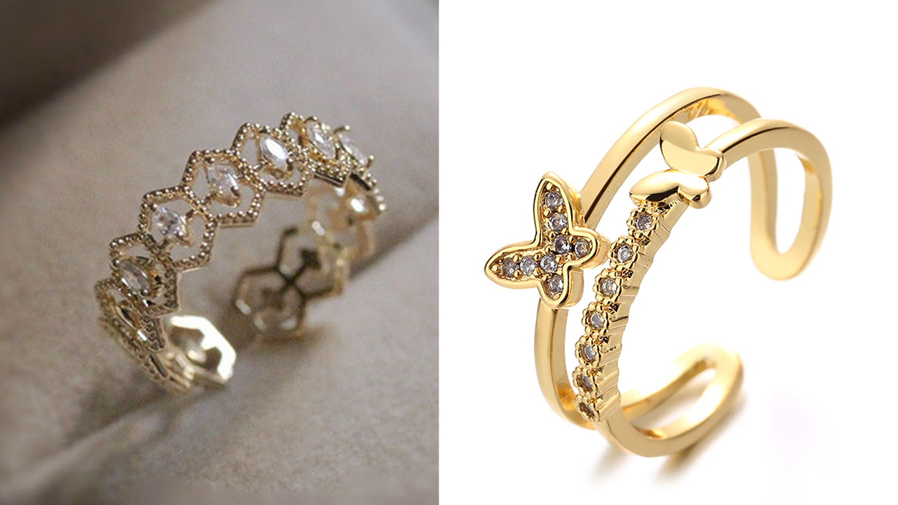 इस रिंग की सबसे बड़ी खासियत है इसका ओपन डिज़ाइन। इसमें रिंग पूरी बंद नहीं होती, बल्कि दोनों एंड खुले होते हैं और एक एंड पर कोई स्टोन या डिजाइन बना होता है। ये मॉडर्न और वेस्टर्न आउटफिट्स के साथ बहुत ही एलिगेंट लगती है। कॉलेज गर्ल्स और ऑफिस गोइंग लेडीज़ के लिए ये बेस्ट है।