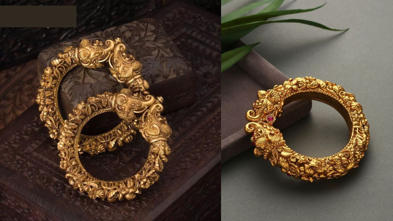टेंपल स्टाइल में हाथी मुंह कड़े की ये डिजाइन बहुत शानदार है। हरी और लाल चूड़ी के साथ ये कंगन बहुत खूबसूरत लगेगी। इसे आप कांच की चूड़ी पहनने के बाद आगे में डालें, ये हाथों को रॉयल लुक देगा।