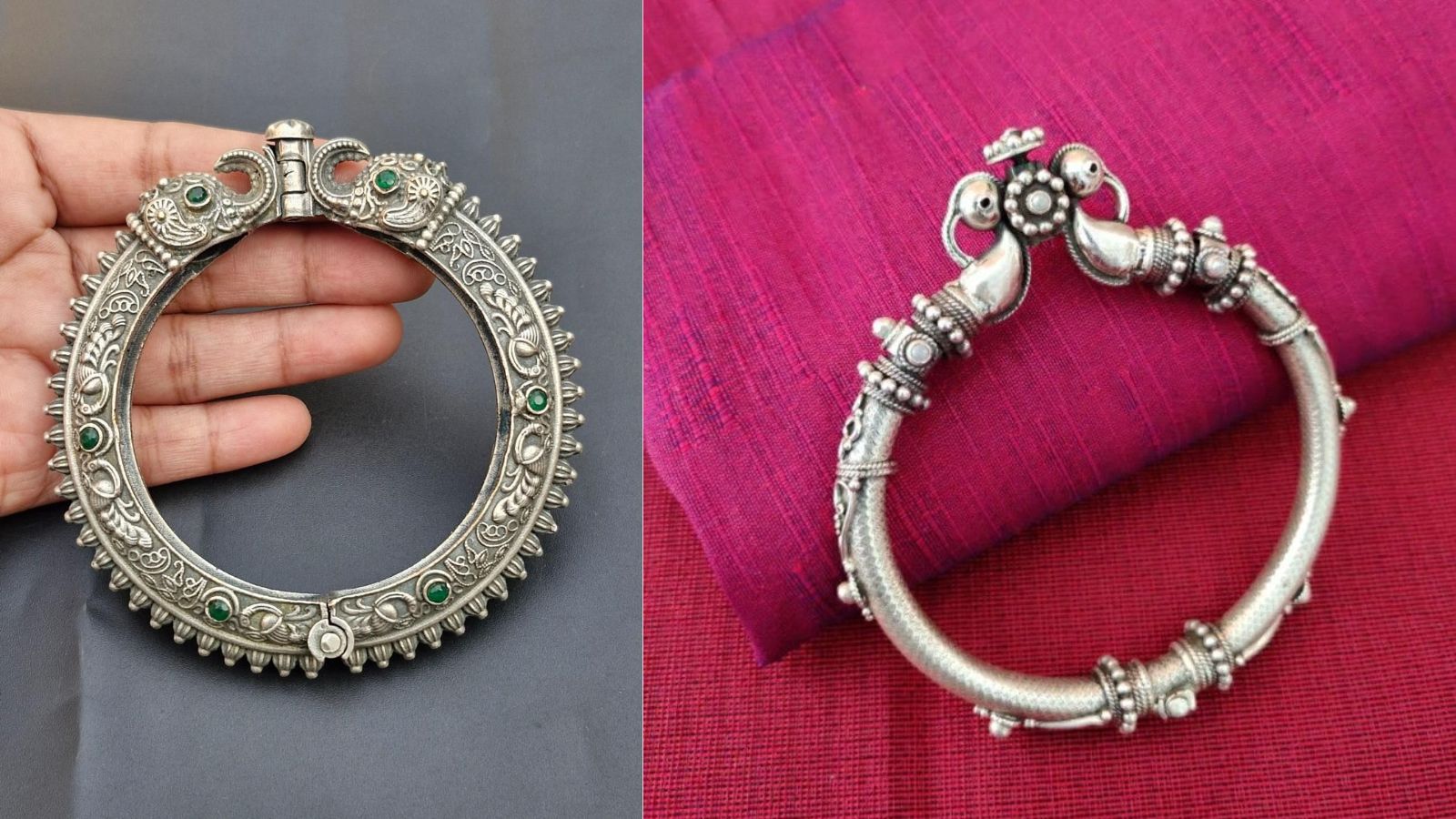 सिल्वर या फिर ऑक्सीडाइज हाथी मुंह कड़े की ये डिजाइन भी बहुत सुंदर है। कम बजट में आने वाली इस कड़े को आप चांदी में भी बनवा सकते हैं। कांच की हरी चूड़ियां या फिर बिना कांच के चूड़ियों के इस पहन सकते हैं।