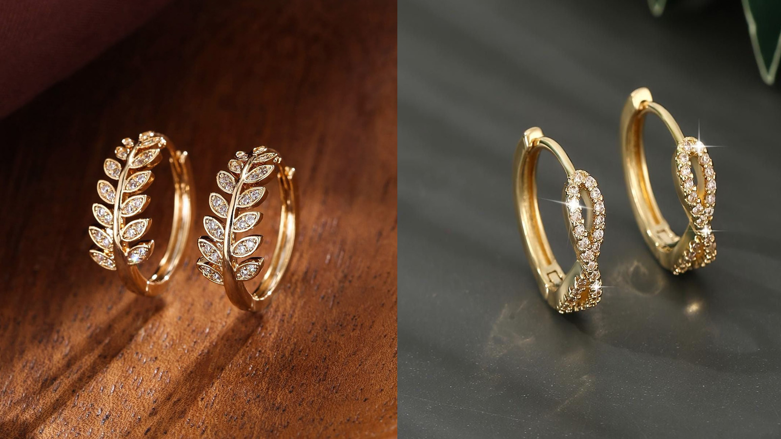 इस इयररिंग डिजाइन में गोल्ड हूप्स पर पत्तियों के आकार की सुंदर कारीगरी की गई है, जिसमें हर पत्ती पर बारीक डायमंड स्टडिंग की गई है। यह डिजाइन नेचर से इंस्पायर्ड है और इसे ट्रेडिशनल और मॉर्डन, दोनों आउटफिट्स के साथ स्टाइल किया जा सकता है। वहीं दूसरी गोल्ड हूप की क्लासिक शेप है। उसे यूनिक बनाने के लिए सामने की ओर क्रिस-क्रॉस शेप में डायमंड लगाए गए हैं। यह डिजाइन थोड़ा और मिनिमल व स्टाइलिश है, जिसे ऑफिस वियर से लेकर पार्टी लुक तक में आसानी से कैरी किया जा सकता है।