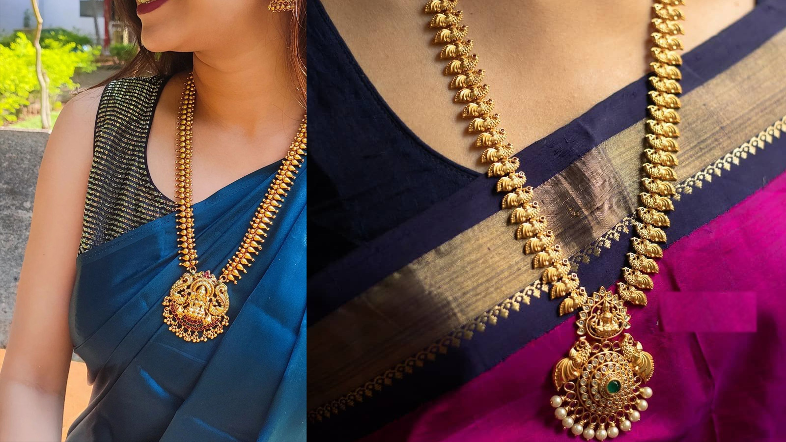 दक्षिण भारत से प्रेरित यह डिजाइन देवी-देवताओं की आकृतियों और नक्काशी के साथ आता है। यह पहनने में भारी और लुक में शाही लगता है। चांदी के चंद्रहार पर सोने का पानी चढ़ाया जाता है। जिसकी वजह से बिल्कुल असली जैसा ये दिखता है।