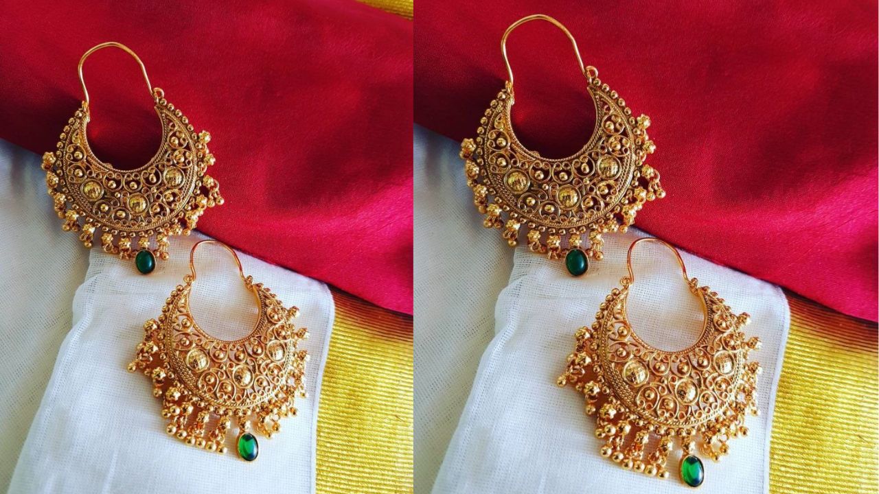 गोल्ड प्लेटेड चांद बाली स्टाइल में हूप की ये डिजाइन टू इन वन पीस है। इसमें आपको हूप के साथ साथ चांद बाली का भी लुक मिलेगा। चांद बाली के साथ हूप की ये डिजाइन में नग, मीनाकारी और मोती का काम करवा सकते हैं, जो काफी अच्छी लगेगी।