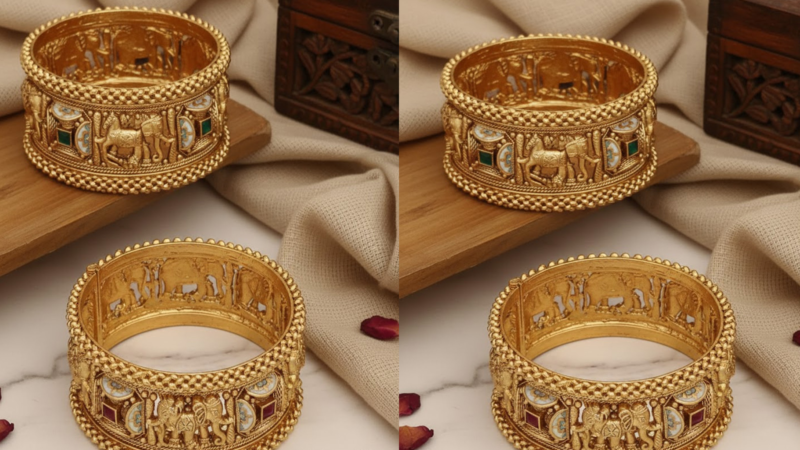 गोल्ड प्लेटेड कंगन आपकी खूबसूरती में खानदानी रुआब जोड़ देते हैं। शादी से लेकर रोज़मर्रा के लुक तक, टेंपल, स्टोन-स्टडेड, कटवर्क और हेवी पोलिश्ड जैसे 4 डिज़ाइंस हर आउटफिट को रॉयल और स्टाइलिश बना देते हैं।