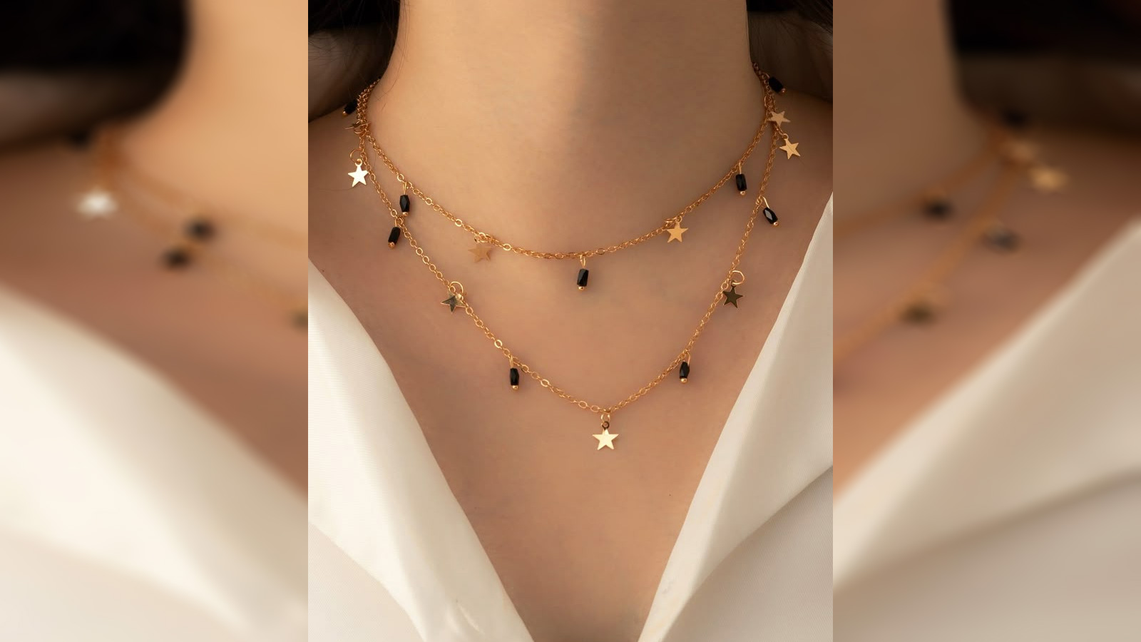 डबल लेयर चेन में छोटे-छोटे स्टार लगे होते हैं। इसके अलावा ब्लैक बीड्स जोड़ा जाता है। यह देखने में काफी आकर्षक लगता है। इस तरह के चेन आप पार्टी में पहनकर जा सकती हैं। वेस्टर्न और एथनिक आउटफिट पर परफेक्ट लगेगा।