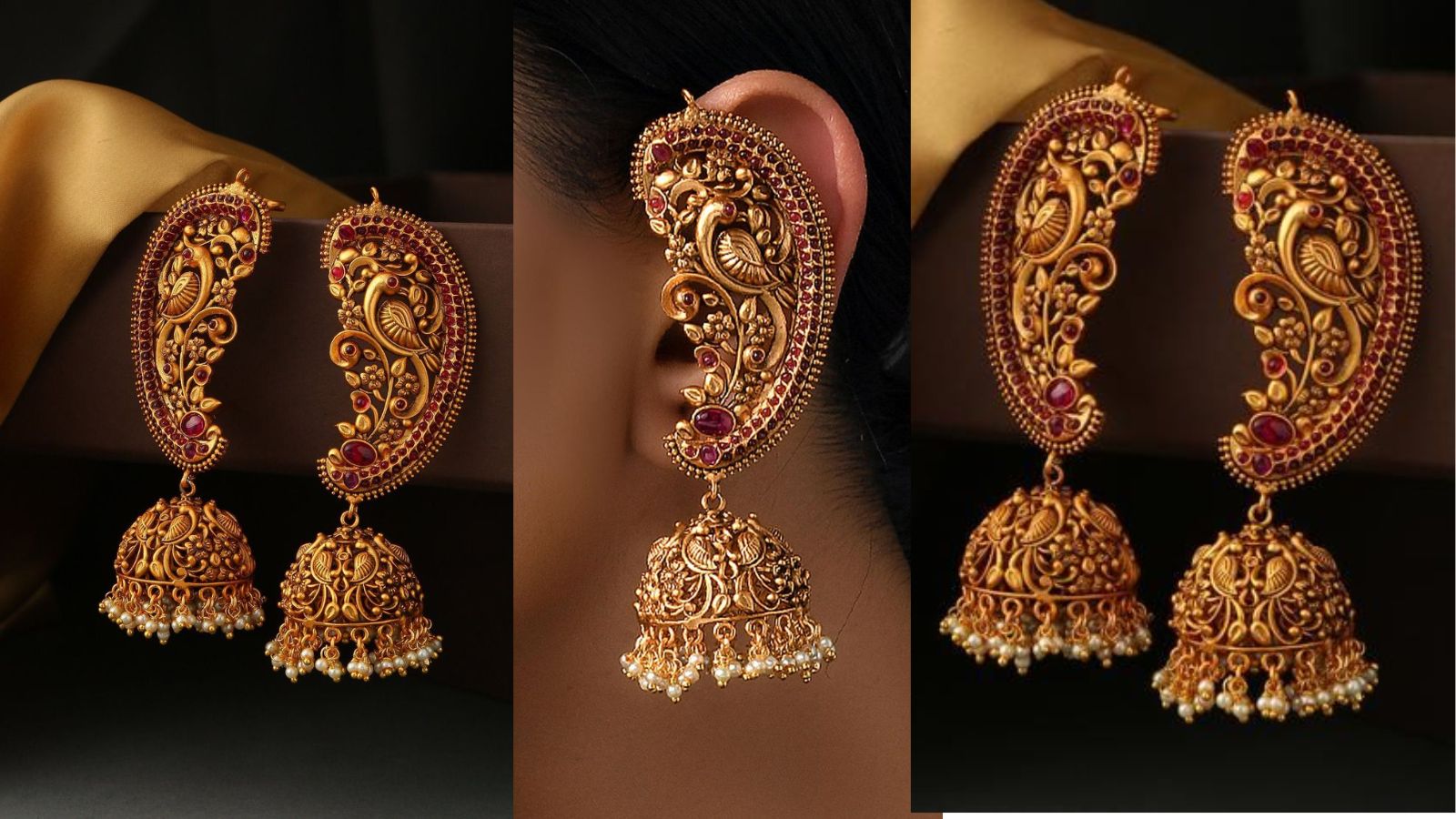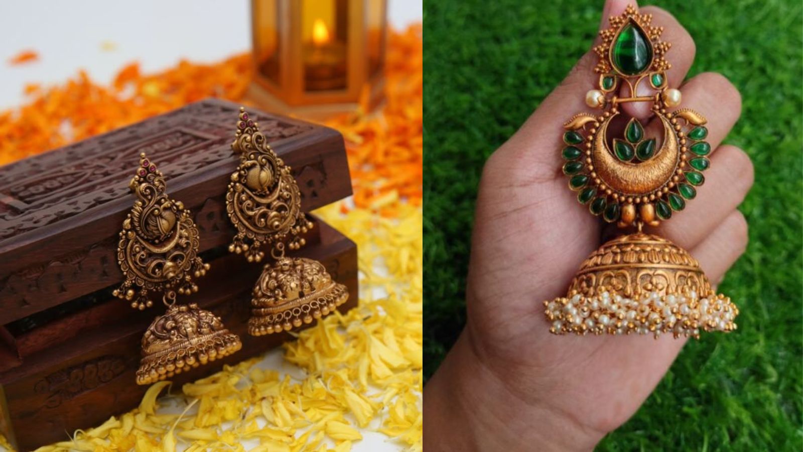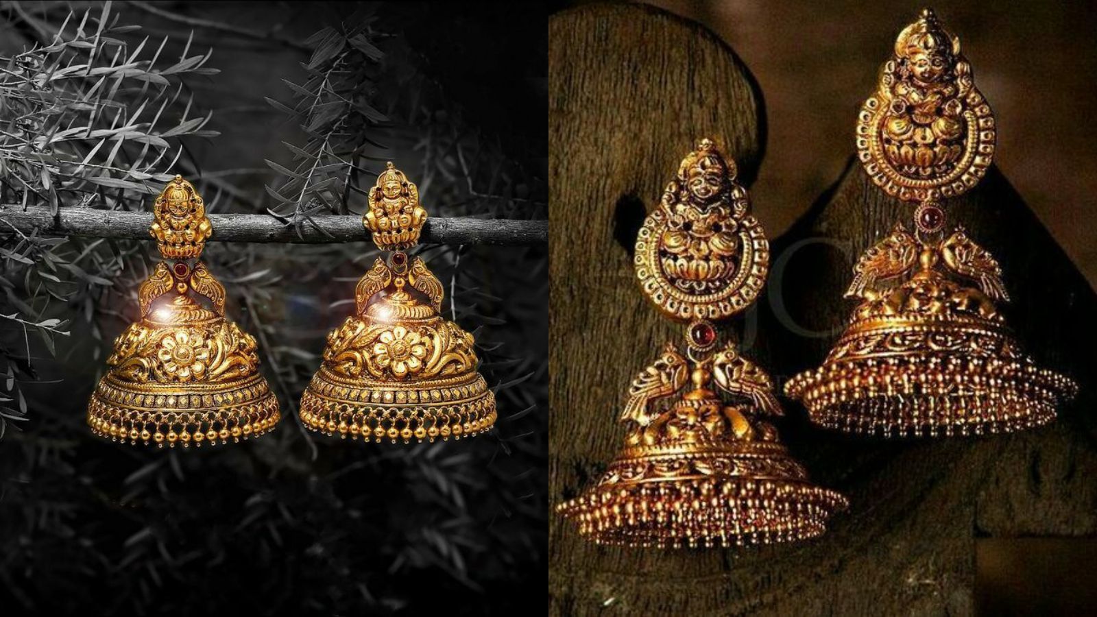 टेंपल जूलरी की शुरुआत साउथ इंडिया से हुई है और सबसे ज्यादा साउथ इंडियन महिलाएं ही टेंपल जूलरी पहनती हैं। साउथ सेलेब्स से अब नॉर्थ इंडिया में भी टेंपल जूलरी का ट्रेंड आ गया है। बात करें टेंपल जूलरी के डिजाइन की तो इसकी खूबसूरत और बारीक नक्काशी के अलावा इसकी शानदार एंटीक पॉलिश और डिजाइन इसकी सुंदरता को अद्भुत और खूबसूरत बनाती है। इसकी यूनिक डिजाइन और नक्काशी के कारण अब हर कोई अपने जूलरी कलेक्शन में टेंपल जूलरी को जरूर शामिल करता है। अगर आप भी टेंपल जूलरी पहनने के शौकीन हैं, तो आज हम आपके साथ टेंपल जूलरी पैटर्न में झुमका की कुठ डिजाइन शेयर करेंगे, जो आपके स्टाइल को देगा स्टाइलिश और शानदार क्लास।