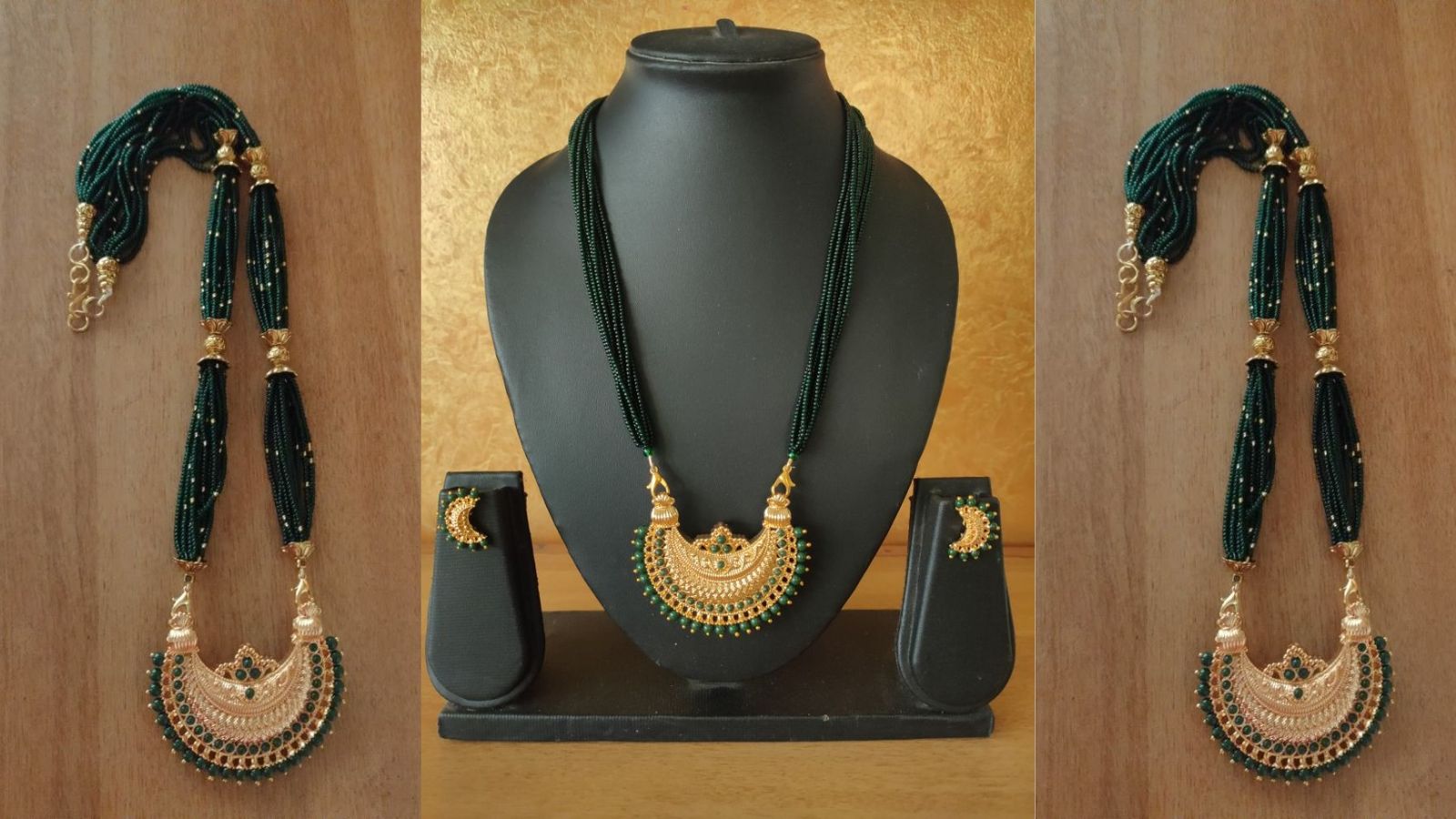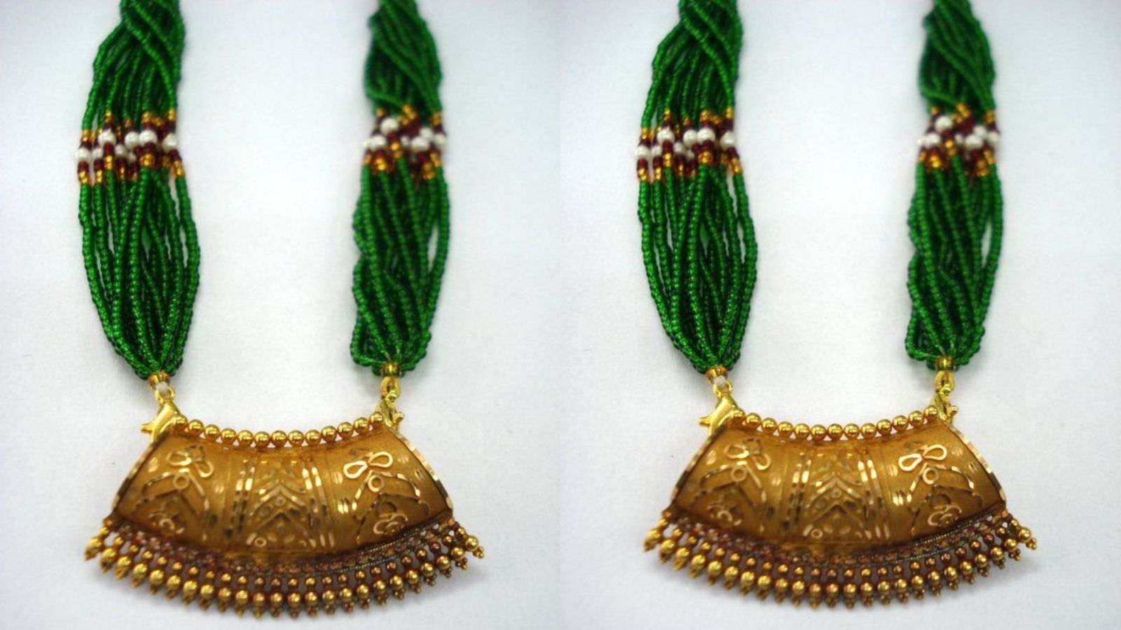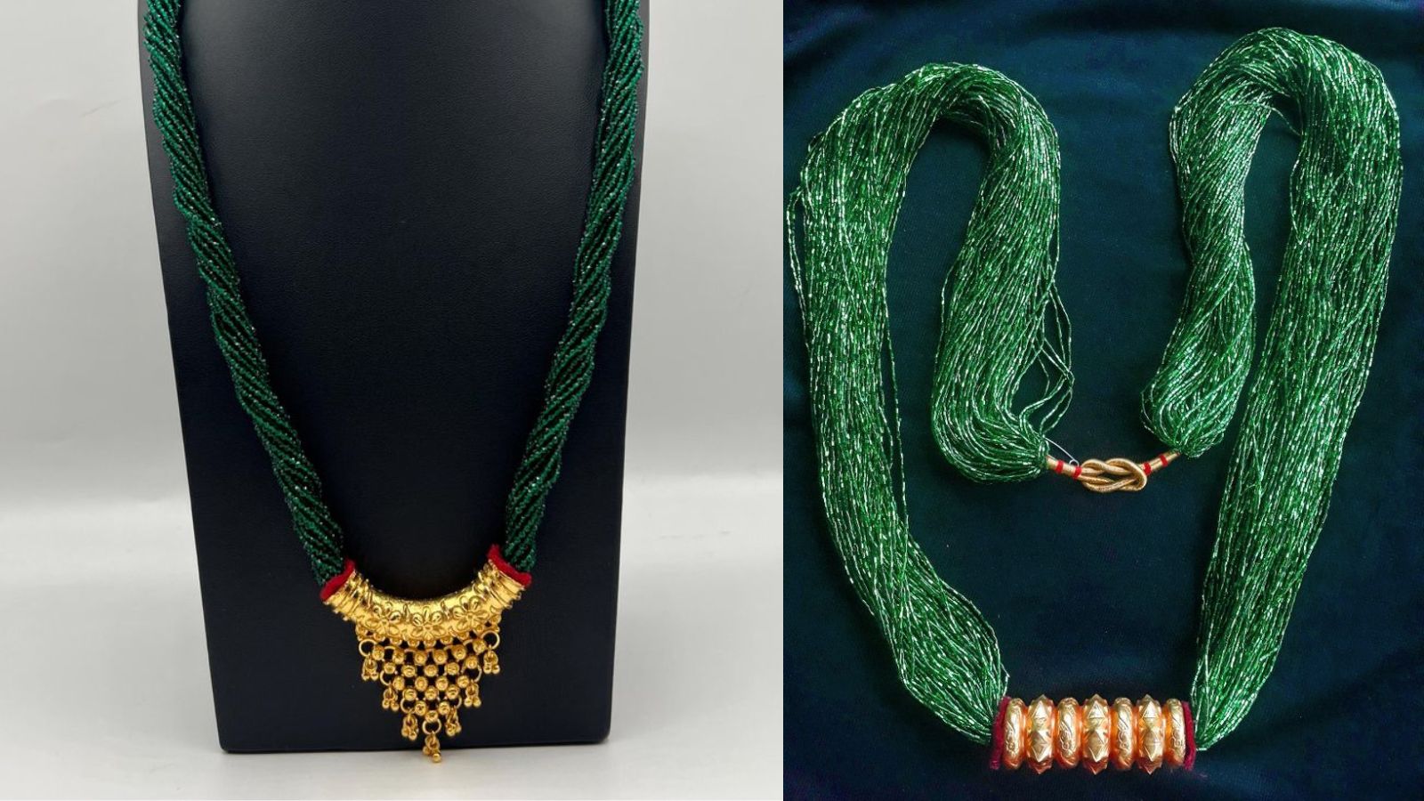 गोल्डन पेंडेंट वाली मंगलसूत्र को आप घर पर ही तैयार कर सकती हैं, बाजार से आप हरे रंग की मोतियां लाएं और उसमें अपने गोल्ड के पेंडेंट को गूंथकर माला तैयार कर लें। ये आपके सावन उत्सव के लिए परफेक्ट पीस हो सकता है।