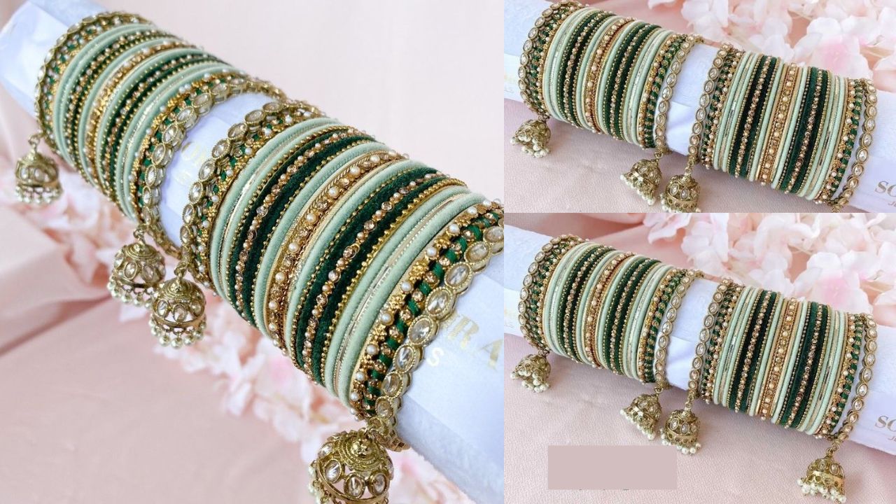 झुमका या लटकन वाली कंगन इस साल की नई दुल्हन के लिए परफेक्ट है। झुमका या लटकन वाली सेट बहुत ही खूबसूरत और स्टाइलिश है। मिंट ग्रीन और डार्क ग्रीन कलर के बैंगल में झुमके वाली कंगनों की खूबसूरती बेजोड़ लग रही है।