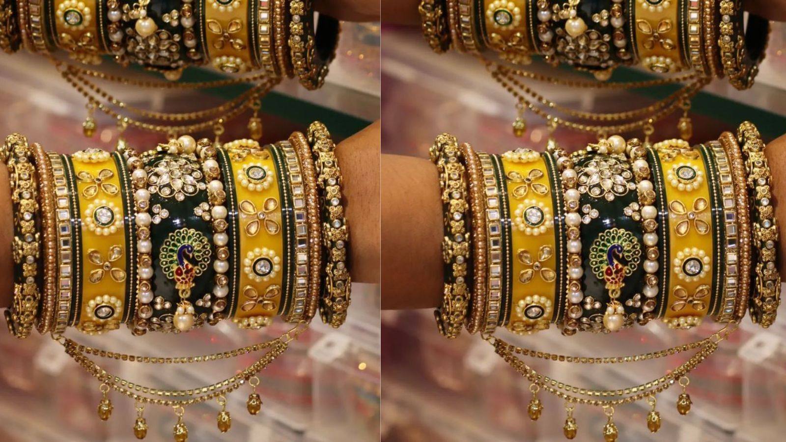 हरे और पीले रंग में ये ब्राइडल सेट दुल्हन और इस साल शादी हुई नई दुल्हन के लिए बहुत सुंदर और खास है। चूड़ी के इस सेट में हैवी गोल्डन कंगन और हरे-पीले चूड़ियों की सेट काफी प्यारी लगेगी।