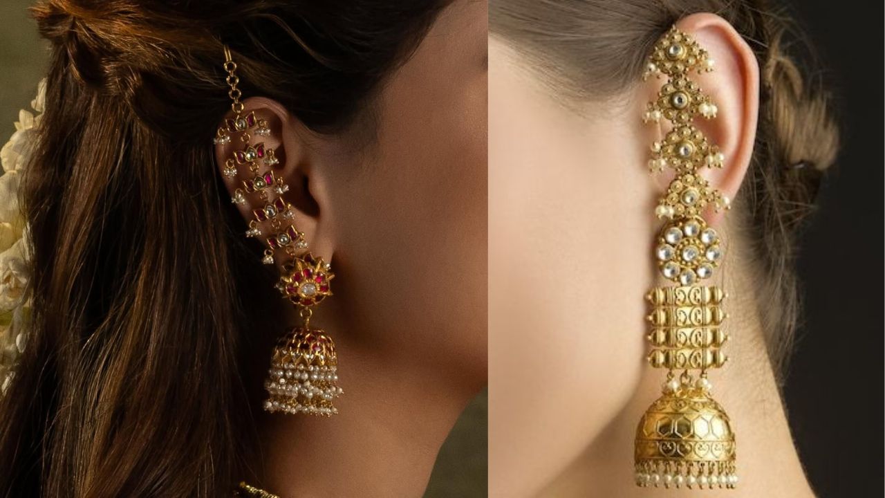 झुमका पहनना पसंद है, तो आप इस तरह के सिंगल झुमका वाली कनचेन इयररिंग ले सकती हैं। इस तरह के डिजाइन आपको एस्थेटिक और एलिगेंट लुक देगी। कुंदन और मोती के काम के साथ चौड़ी चेन और झुमके की डिजाइन बहुत लाजवाब लग रही है।
