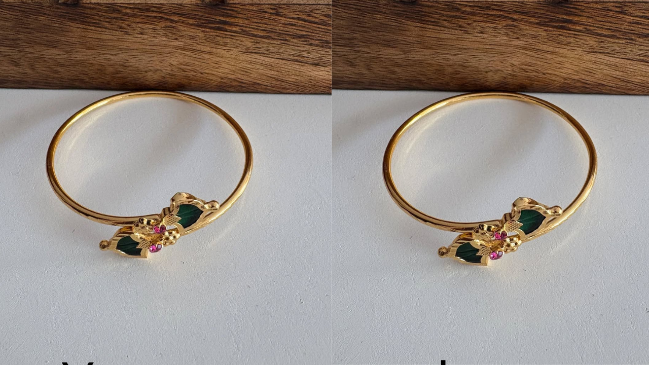 आप ज्यादा ज्वेलरी पहनना पसंद नहीं करती हैं तो वॉर्डरोब में पालक्का ब्रेसलेट कड़ा जरूर शामिल करें। इसे मैरिड और यंग गर्ल्स ट्राई कर सकती हैं। यहां ओपनेबल Cuff Design हाईलाइट करते हुए एंडेड कड़ा सा लुक दिया गया है, जो मॉडर्न लुक दे रहा है। इसमें, फ्लोरल लीफ डिजाइन दी गई है, जहां ग्रीन स्टोन संग Enamel Work है। साथ में स्मॉल पिंक स्टोन सुंदरता और ज्यादा बढ़ा रहे हैं। ये पारंपरिक+मॉडर्न का परफेक्ट स्पर्श है। इन्हें भी 300-500रु में खरीदा जा सकता है।