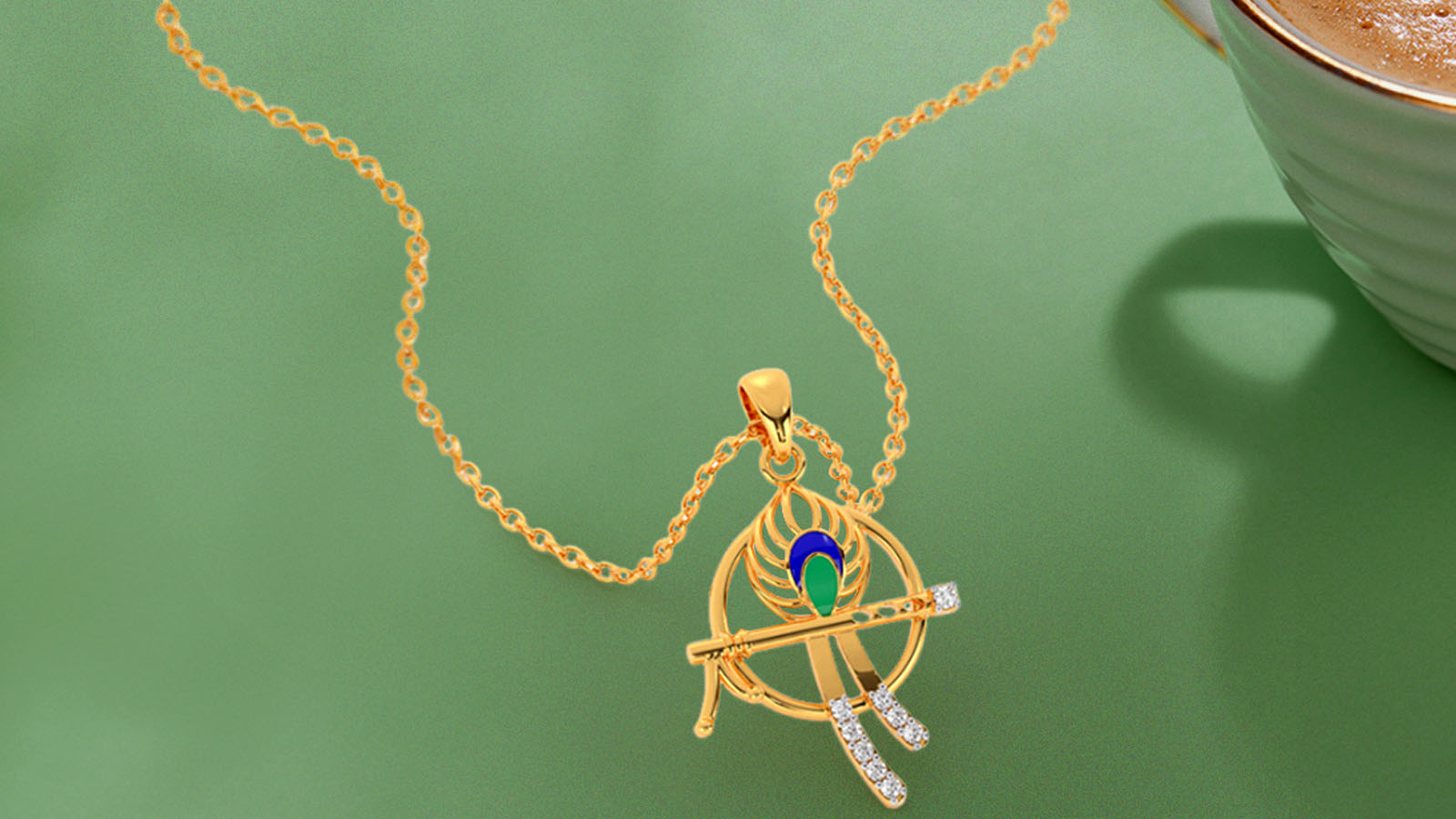 मोर पंख को गोल्ड में क्राफ्ट करके इस तरह का डिजाइन आप बनवा सकती हैं। उस पर हरे और नीले रंग की एनामेल वर्किंग देने से पेंडेंट में ग्रेसफुल लगता है। आप इसे जन्माष्टमी पूजा के पारंपरिक लुक के लिए चुन सकती हैं और फेस्टिव लुक को पूरा कर सकती हैं।