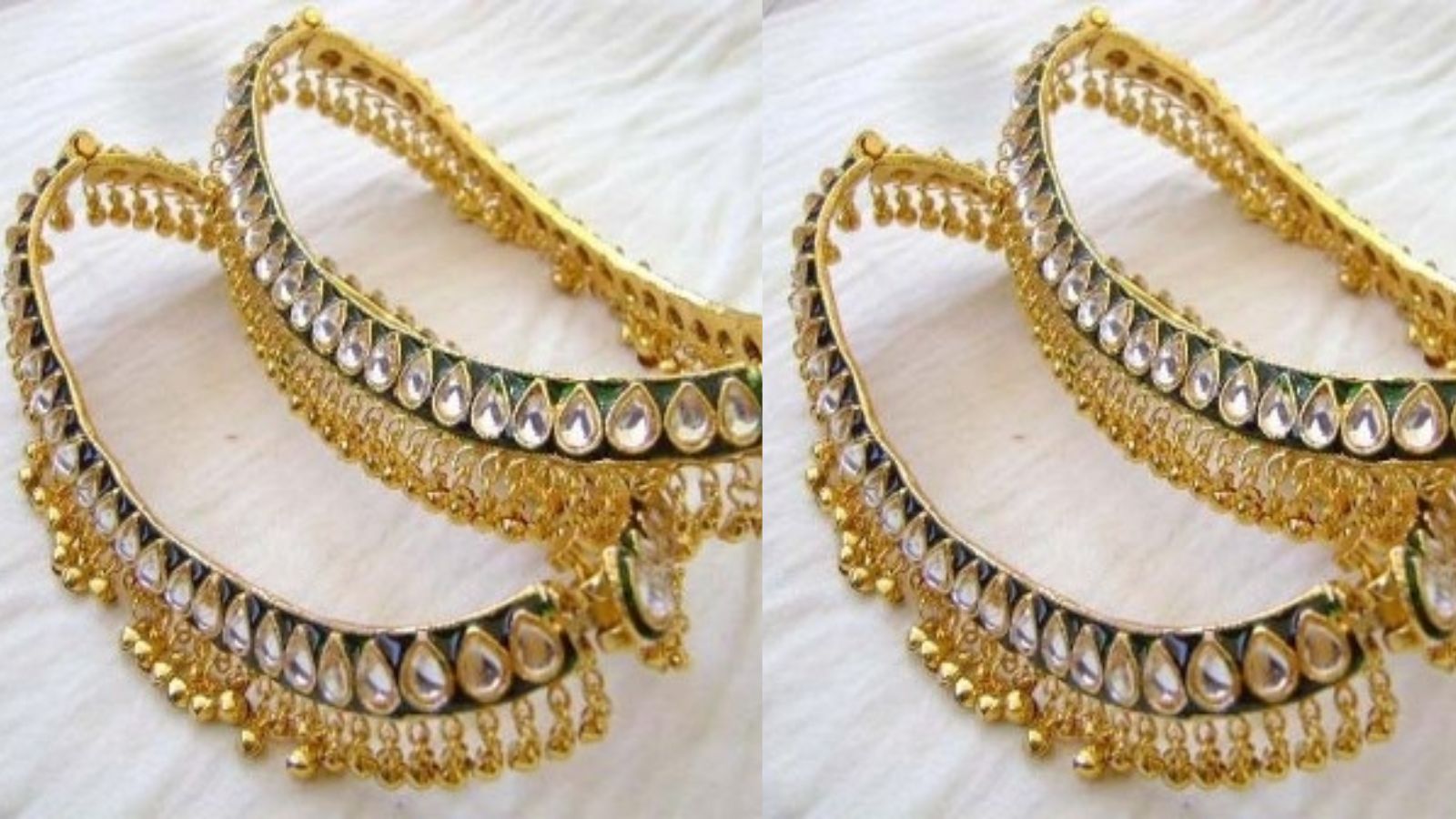 घुंघरू वाले पायल की ये डिजाइन भी आपको फिट पैटर्न में मिल जाएगी, इसमें कुंदन का बहुत खूबसूरत काम हुआ है और यह सुनहरे रंग में आपको मिल जाएगी। इस तरह के पायल आजकल मार्केट में खूब पसंद किए जा रहे हैं और हरी साड़ी के साथ मैच भी होगी।