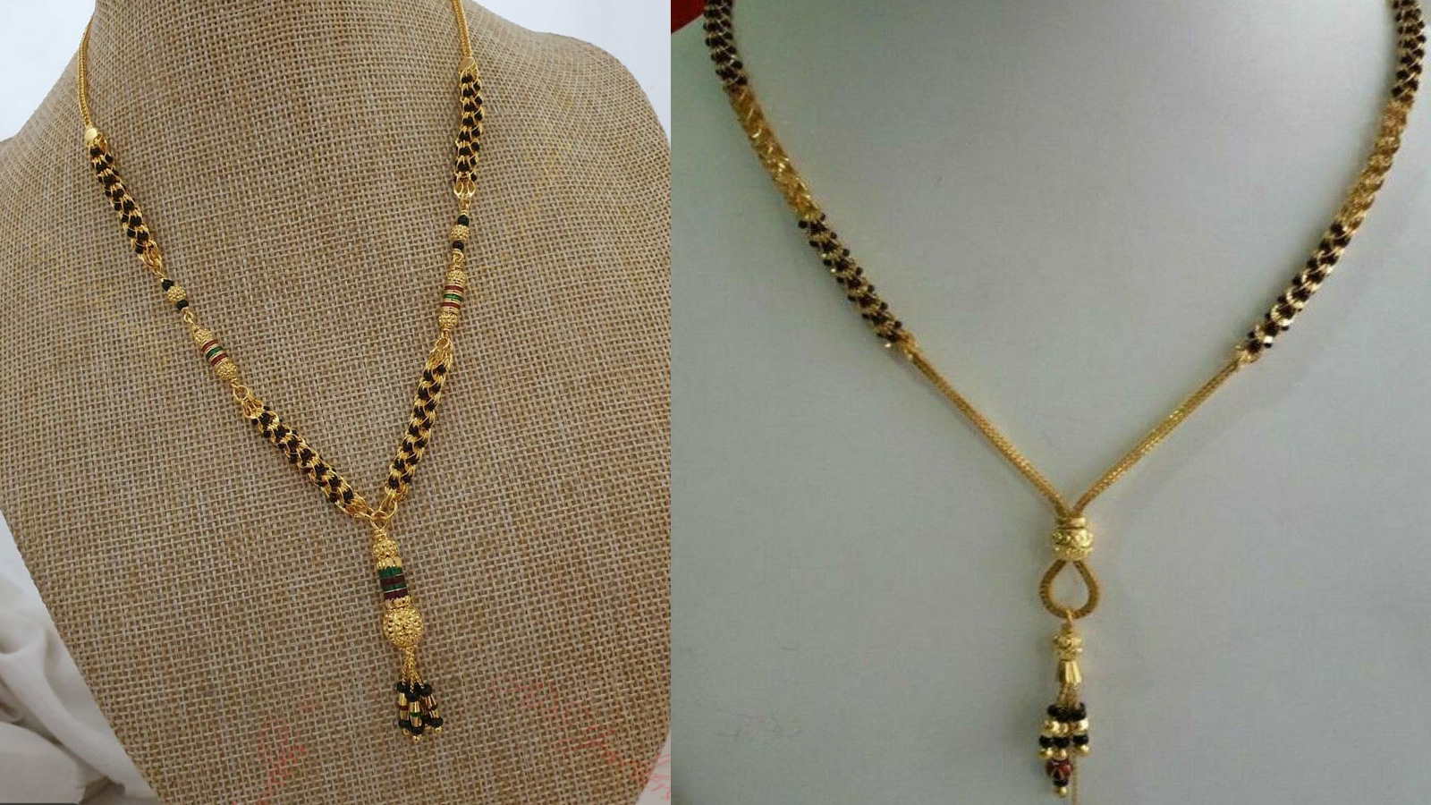 ब्लैक बीड्स और गोल्ड चेन को चोटी जैसी डिजाइनिंग में पिरोया गया है। एक डिजाइन में राउंड पेंडेंट लगाया गया है जिसमें ब्लैक बीड्स की लटकन है, जबकि दूसरे में पेंडेंट को झुमकी स्टाइल में रखा गया है और उसमें गोल्ड व ब्लैक बीड्स का कॉम्बिनेशन दिया गया है। दोनों डिजाइन यूनिक हैं और साड़ी या लहंगे के साथ पहनकर आप क्लासिक लुक पा सकती हैं।