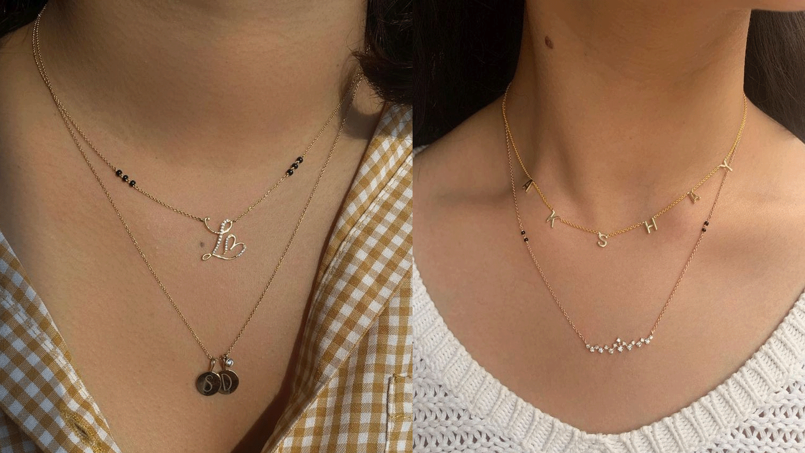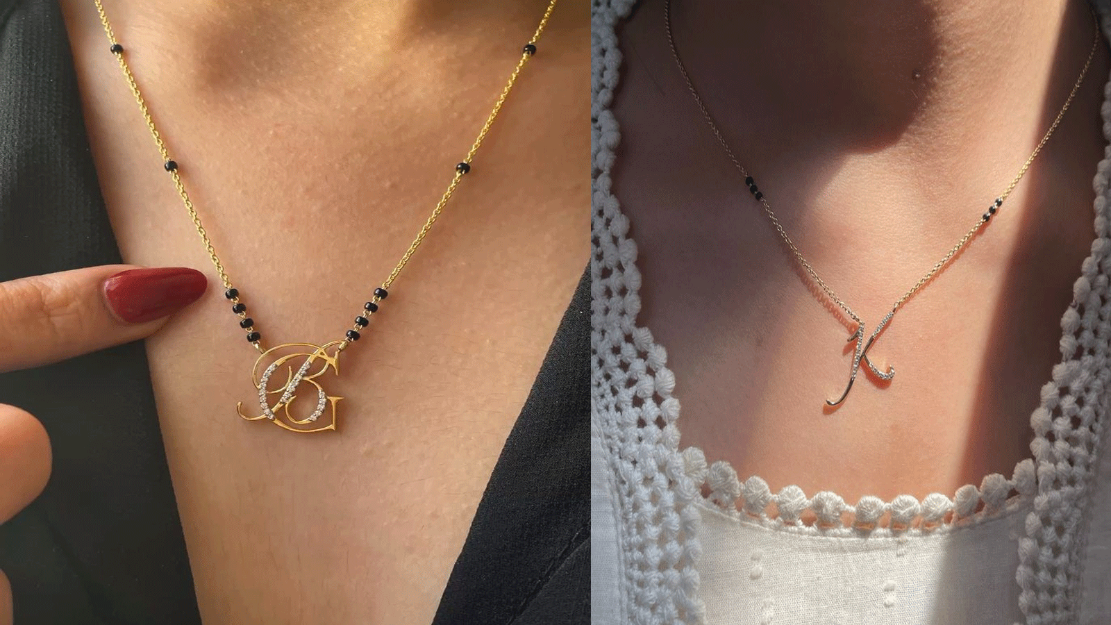 अपनी या पार्टनर की नाम की पहली अक्षर (A, B, S, R जैसे) को पहनना एक इमोशनल कनेक्शन का सिंबल बन गया है। यहां पर दो डिजाइंस दिखाए गए हैं। एक मंगलसूत्र पेडेंट में B और G को एक साथ रखा गया है। जो काफी यूनिक लग रही है। वहीं दूसरे में K लेटर को मंगलसूत्र के साथ जोड़ा गया है।