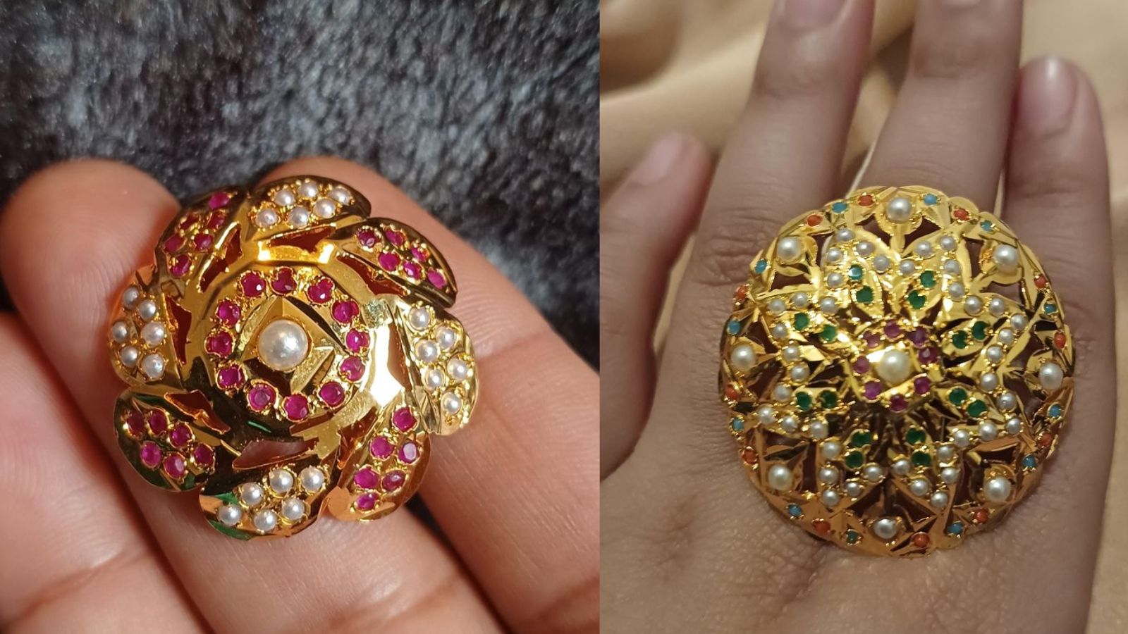जड़ाऊ अंगूठी की ये डिजाइन 6-7 ग्राम में बन जाएगी और दिखती है डेढ़ दो तोले से भी ज्यादा बड़ी और हैवी। इस तरह के हैवी लुक वाले जड़ाऊ अंगूठी शादी ब्याह और तीज त्यौहार में पहनने के लिए बहुत सुंदर है।
